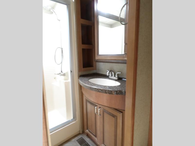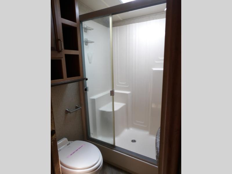 Up the steps towards the front of the fifth wheel the bathroom is on your left. It includes a vanity sink, medicine cabinet, residential size shower with seat, toilet and overhead cabinet.