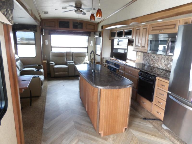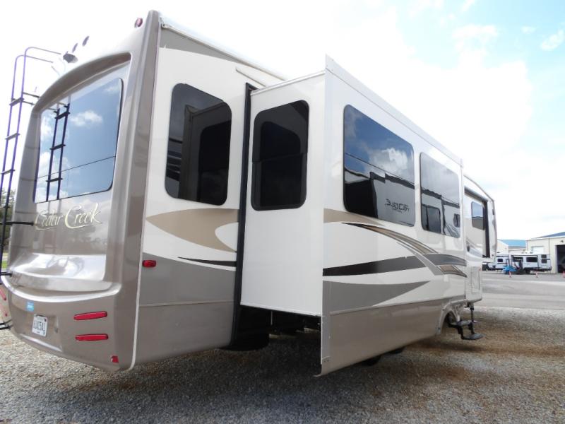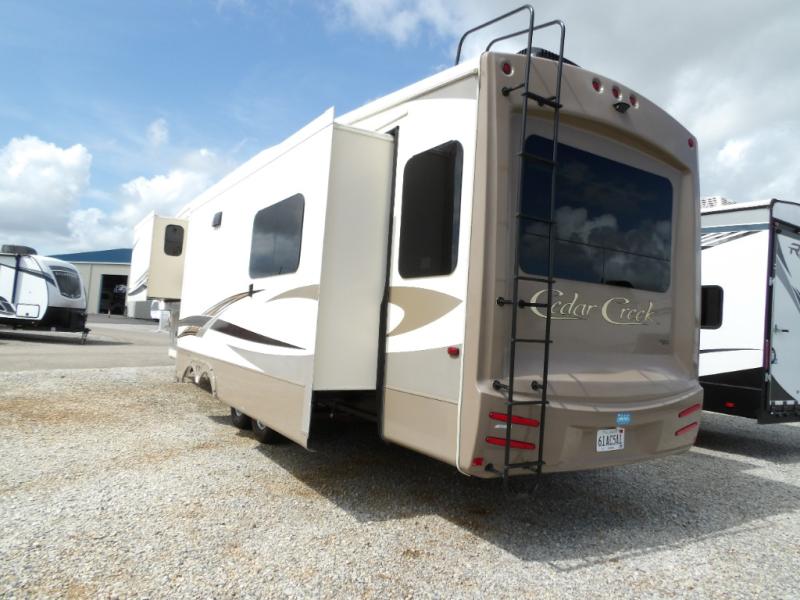 This triple slide Cedar Creek 36CKTS Fifth Wheel by Forest River offers spacious living accommodations for all the comforts of home.