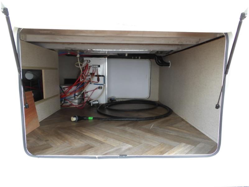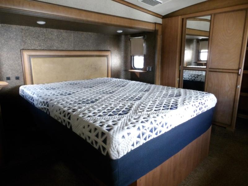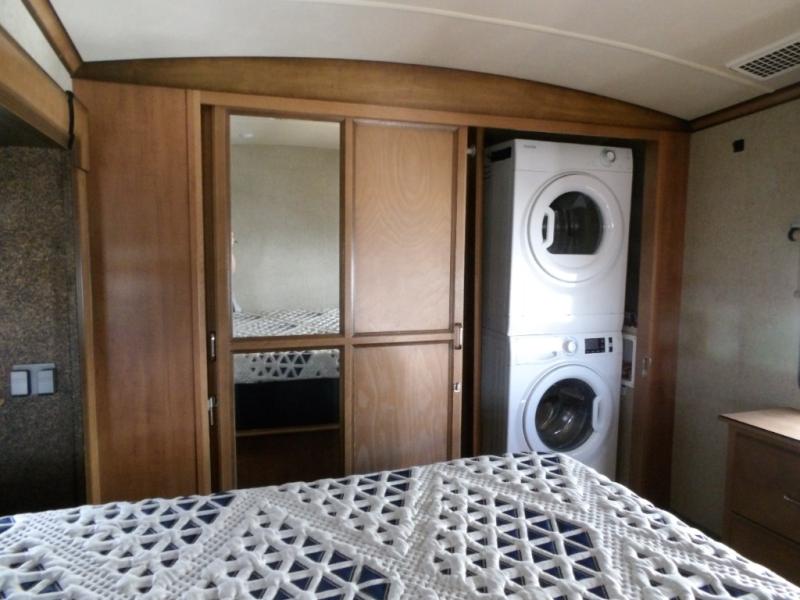 The private front bedroom offers a queen bed slide out with a shelf on either side. There is also a linen area with hamper, dresser and full width wardrobe with shelves and drawers for all of your storage needs and much more.
