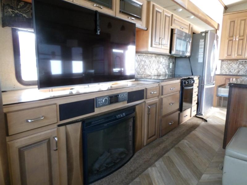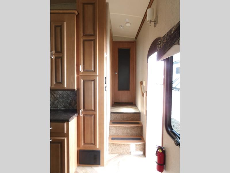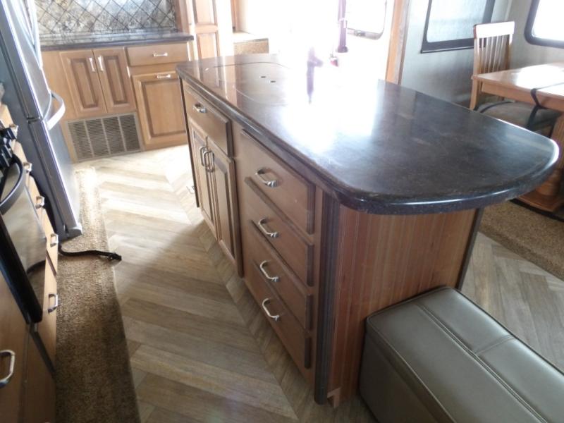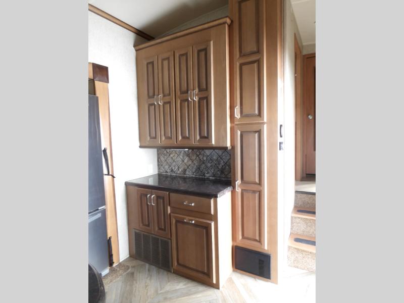 Two generous slide outs are located in the main living/kitchen area. As you enter this Cedar Creek, to the left is a slide out which has a free standing dinette with chairs, and two lounge chairs. A sofa with end table at each end and overhead cabinets runs the width of the back wall. Continuing around, another slide features a fireplace with TV lift, three burner range top, overhead microwave, pantry, refrigerator, and overhead cabinet storage. The kitchen is rounded out with a beautiful Hoosier style kitchen cabinet with extra counter space, a closet and an island with a double kitchen sink. You may choose to add an optional dishwasher to the island.
