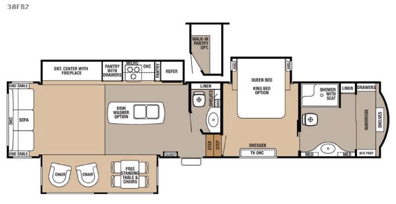 Head up the steps to the right of the main entry door and find a spacious master suite with slide out queen or king size bed, the choice is yours! There is a dresser opposite the bed along the curb side wall that also features a TV and overhead storage as well. A sliding door leads into a front master bath including a toilet, shower with seat, nice size vanity with his and her medicine cabinets, plus linen storage. You will also find a full wall wardrobe for your clothing storage that includes drawer space, shelves, and is washer/dryer prepped if you choose to add the appliances, plus so much more!