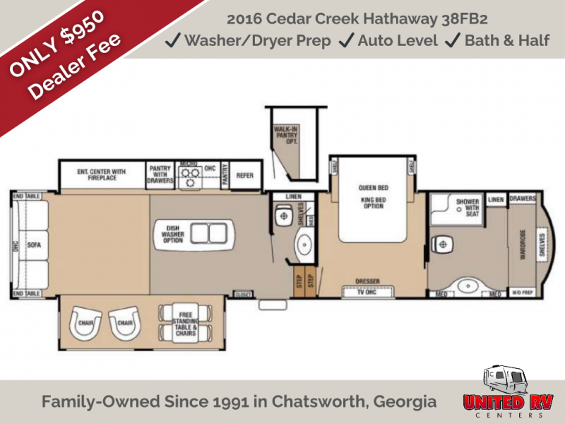 Cook up your camp favorites easily in this Hathaway Edition fifth wheel with all that is provided. There are two pantries, one includes drawer space. There is also a refrigerator for your perishables, and a three burner range with overhead microwave oven. An added bonus of a kitchen island is front and center and includes a double sink for dishes, or you can add a dish washer option and let it do them for you so you can get back to having fun!