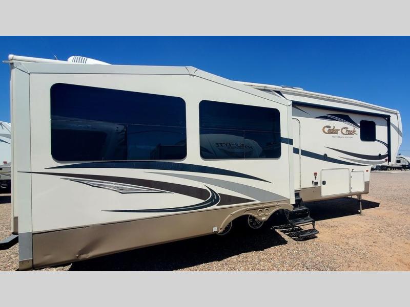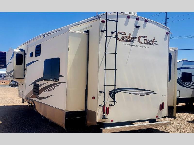 The Cedar Creek Silverback 29IK fifth wheel by Forest River offers triple slides with the opposing slides in the main living area cathedral ceiling height, plus this unit also features a rear entertainment layou, and more.