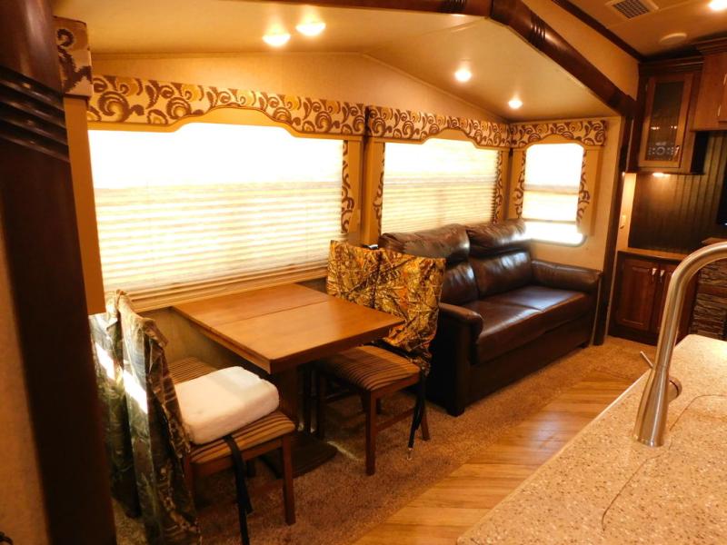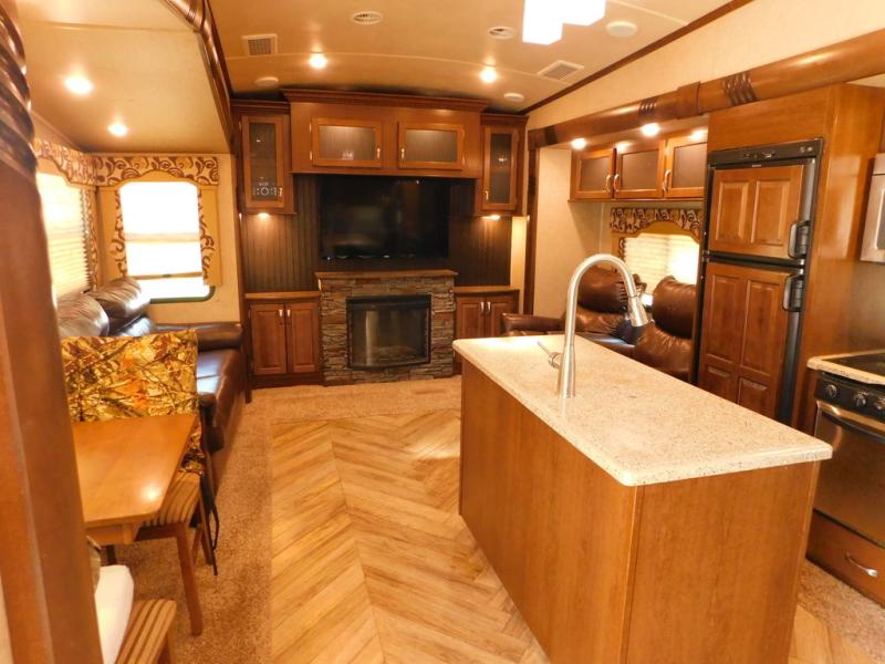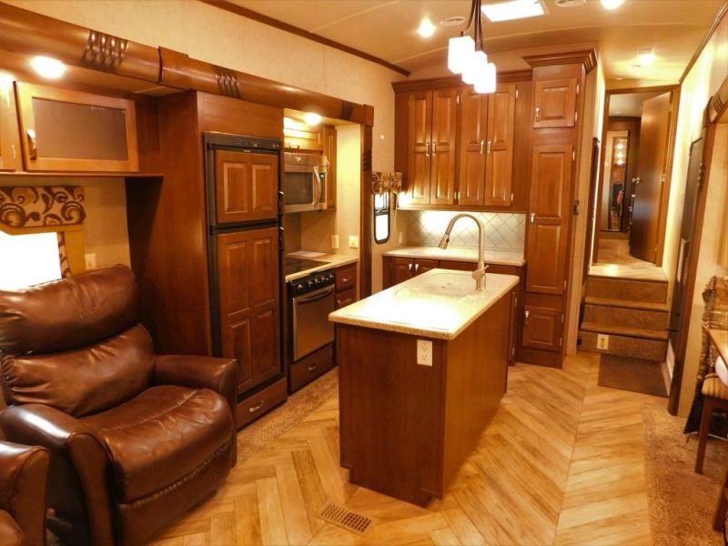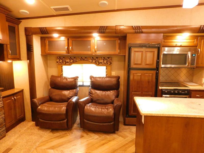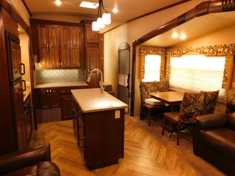 Step inside model 29IK and find to your left a slide out free-standing table with chairs along with a sofa. The rear wall offers a full entertainment center for your enjoyment. There is another slide with two lounge chairs, plus the kitchen appliances that include a refrigerator, a microwave, and three burner range. The kitchen also has a an island where you will find a double sink, and lots of counter space for food prep and serving.