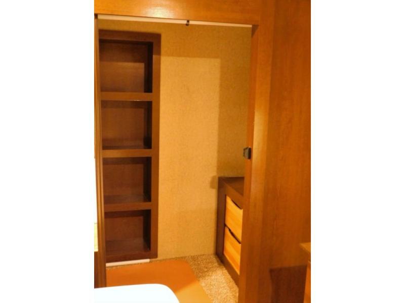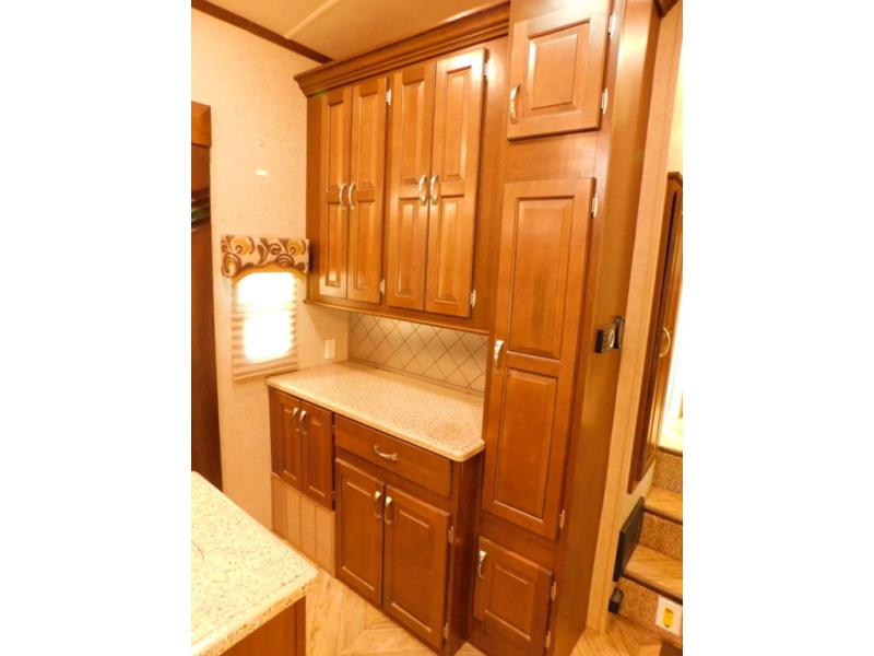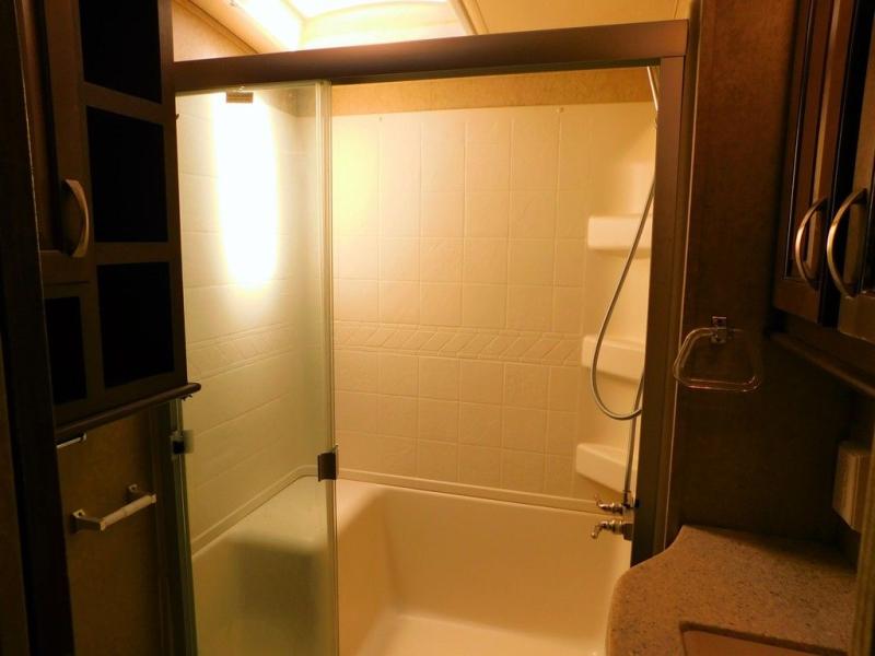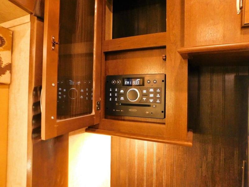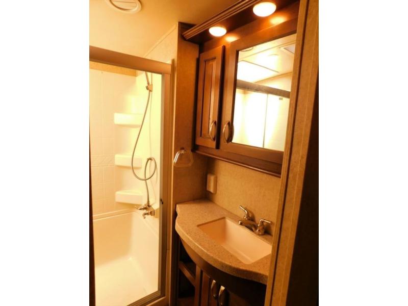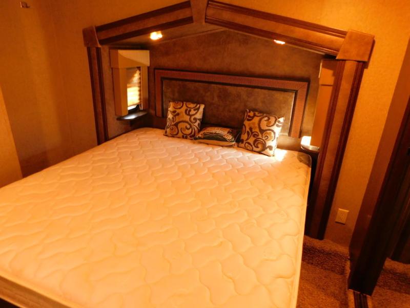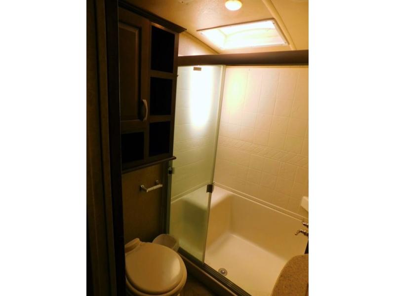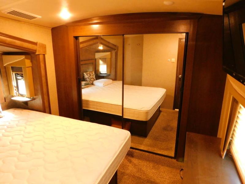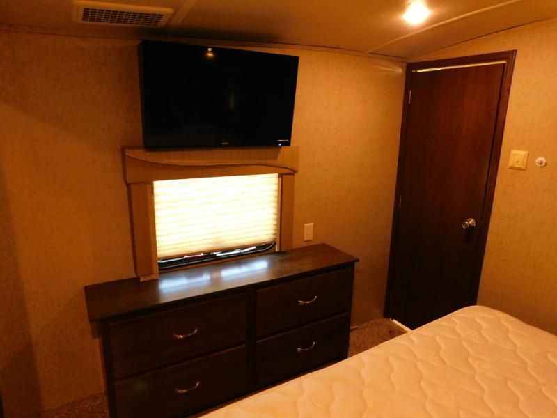 In the bedroom there is a queen bed slide with shelves on either side, or you can choose an optional king size bed if you like a bit more sleeping space. There is much storage with the front wardrobe. Across from the bed you will find a dresser with a TV above it. Also in the wardrobe a portion has been prepped so you can choose to add the convenience of a stackable washer/dryer if you'd like. There are also shelves, drawers, and more!