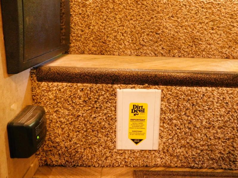 Head up the steps to the right of the entrance and find a full bath on your left. Inside the bathroom you will find a linen cabinet, a toilet, a shower with seat, sink, and medicine cabinet.