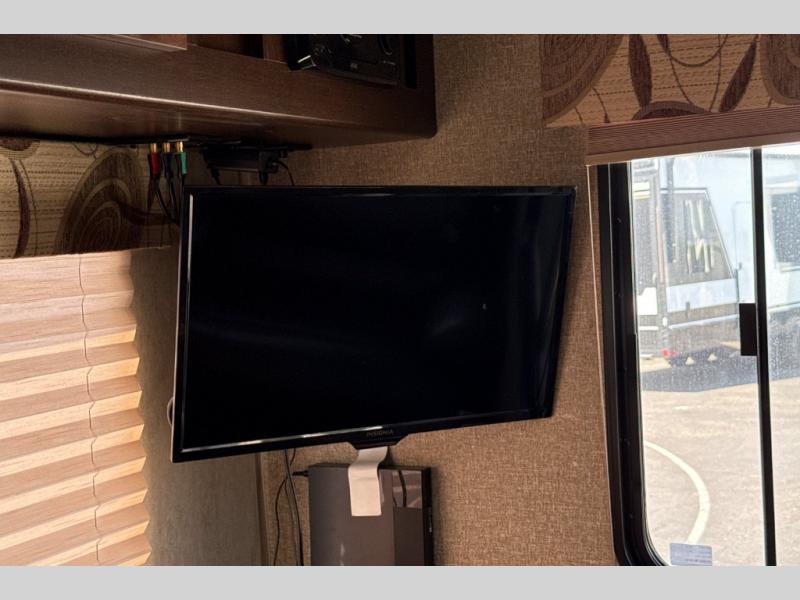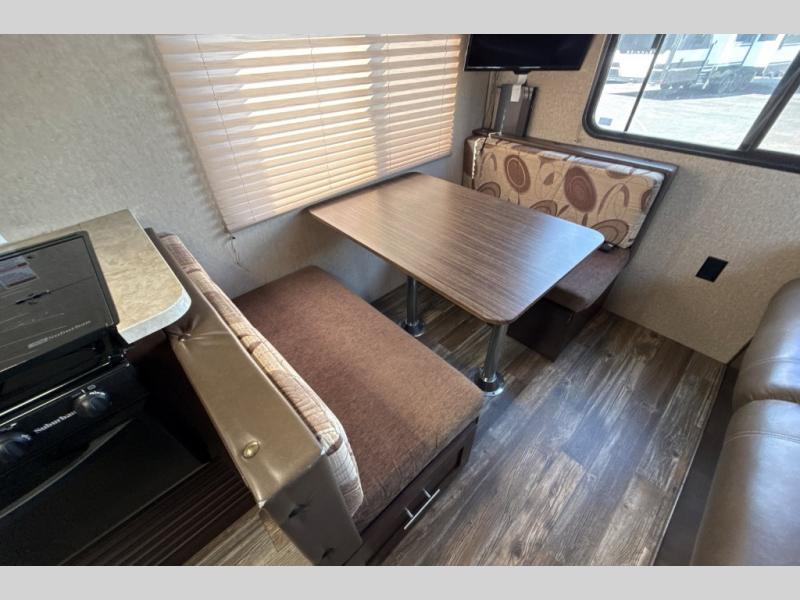 Located in the rear there is a dinette along one side of the trailer with a TV above, and a sofa across from the dinette.