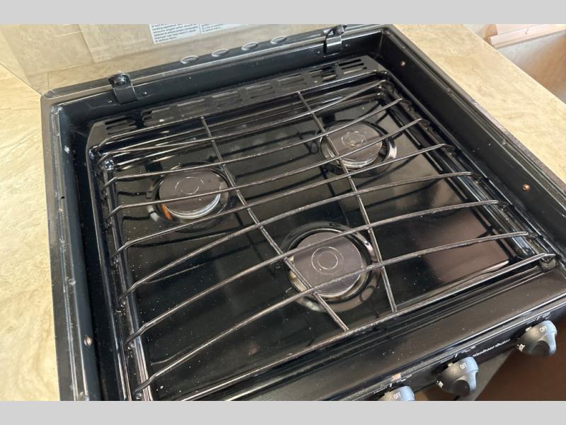 In the gallery there is a double kitchen sink, range, and microwave along one side of the trailer. The other side has a refrigerator and a pantry.