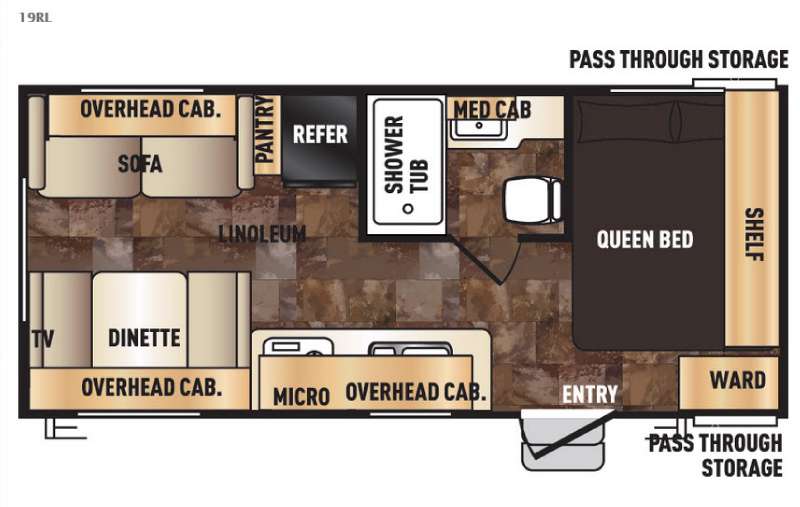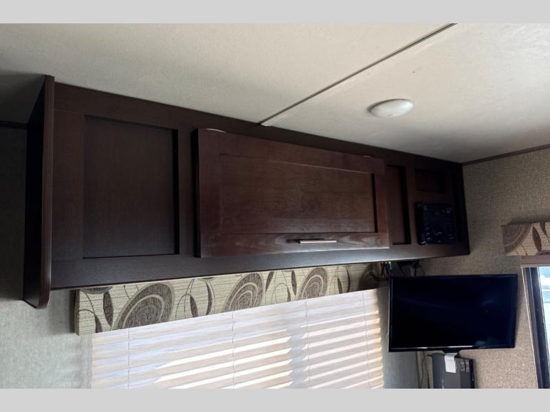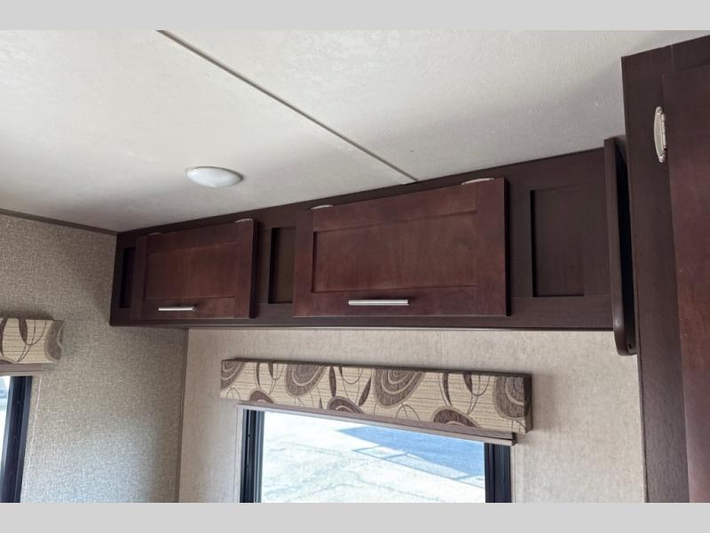 Throughout the trailer you will find many overhead cabinets as well as outside there is a large pass through storage area under the front bedroom, and much more.