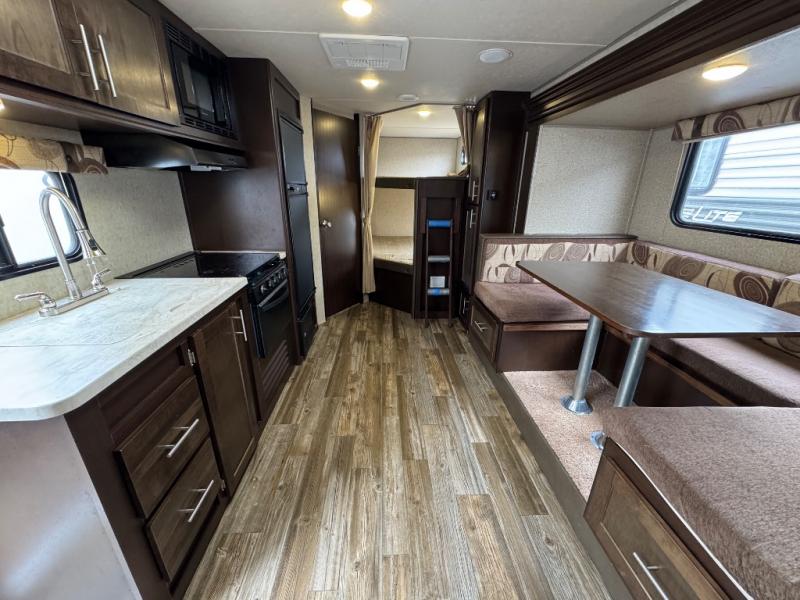 As you enter the travel trailer, to the left is a large sink, three burner range, microwave, and refrigerator. The opposite side offers a u-dinette slide, and pantry. In the front of the living area there is a LCD TV mount.