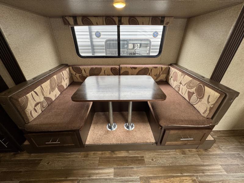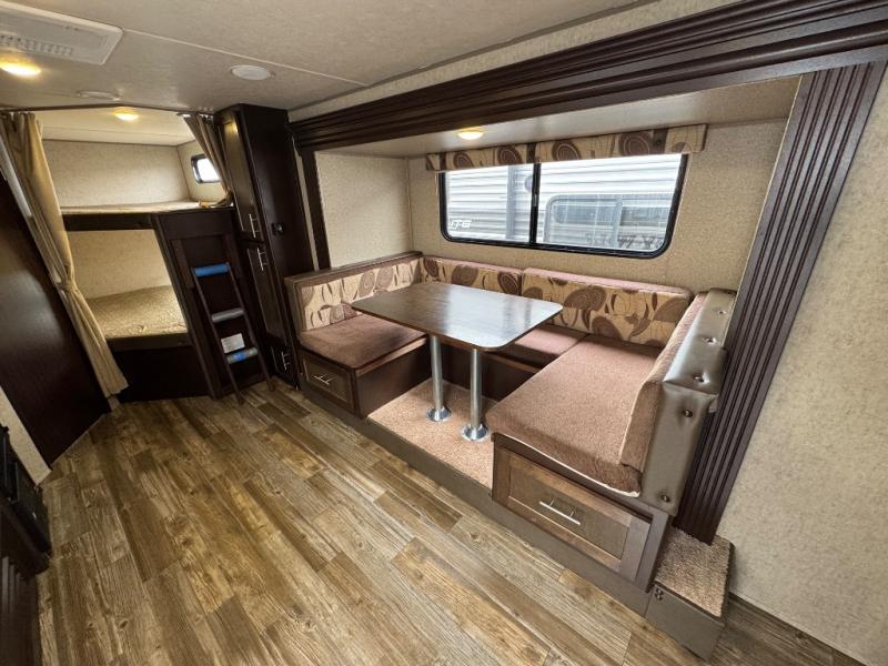 Enjoy taking your family camping in the Cherokee Grey Wolf 23DBH travel trailer by Forest River. This model offers a u-dinette slide and a rear set of bunks.