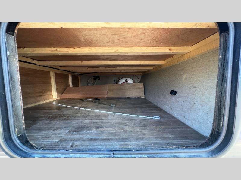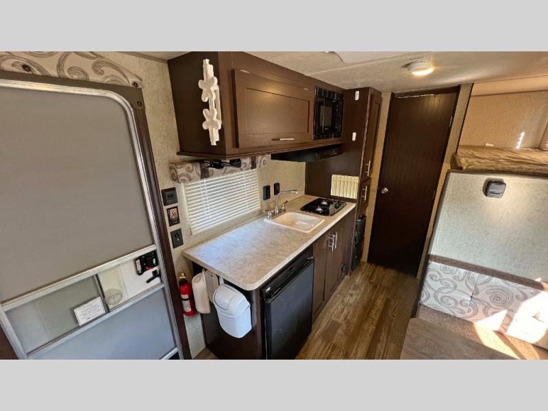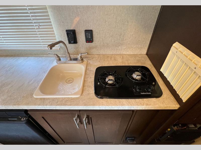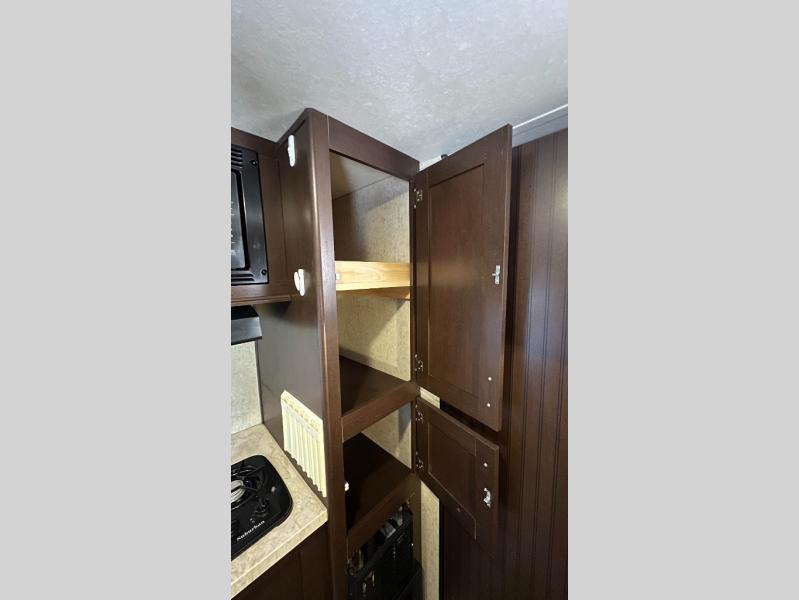 To the left of the entrance you will find a cooking area featuring plenty of counter space, a single sink, a two burner cook-top, and refrigerator for your perishables located beneath the counter. There is also a pantry for dry and canned goods, as well as storage for dishes and things.