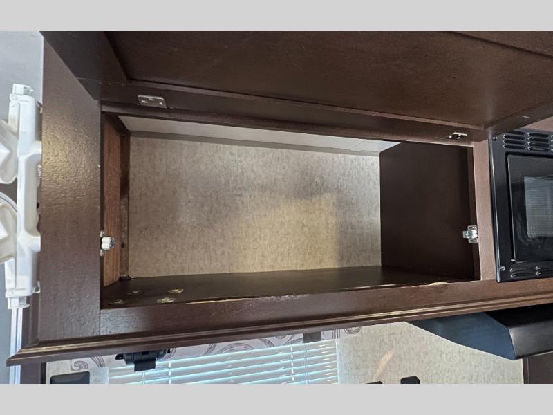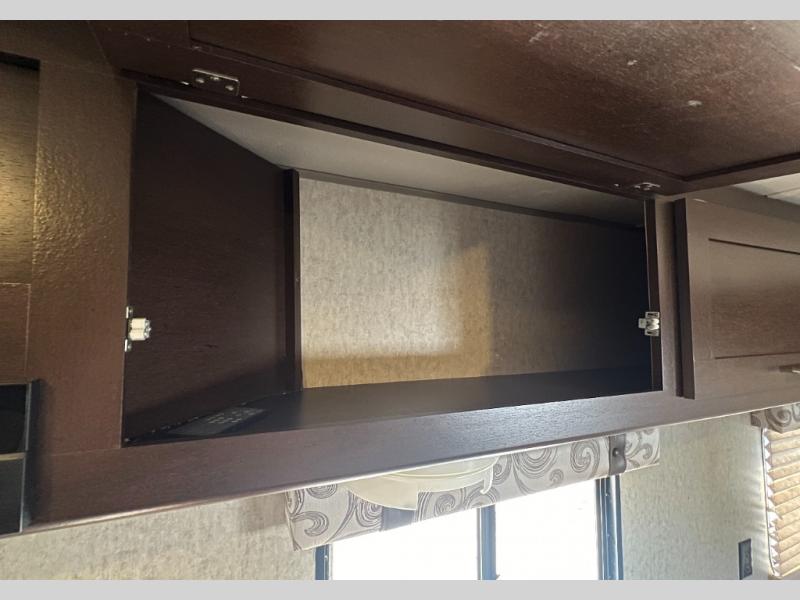 Step inside and find a queen size bed across the front with storage cabinets above two side, over the head of the bed, and along one side. The side cabinets stretch from the head of the bed along the road side wall over the dinette that is located straight across from the door.