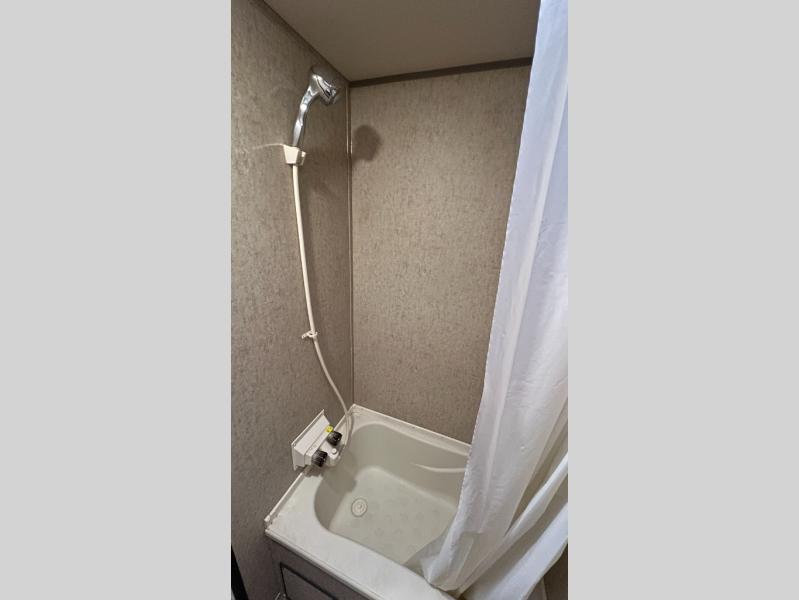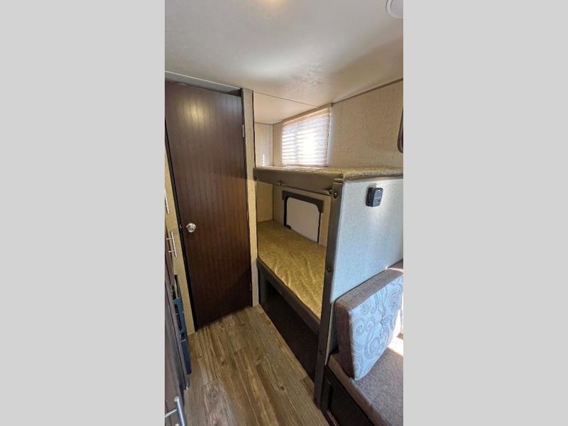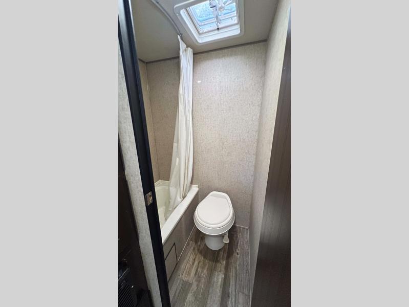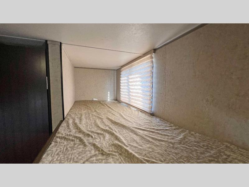 The very back left corner features a private tub/shower and toilet area. Right next door a set of bunks that the kids will enjoy sleeping on, plus so much more!