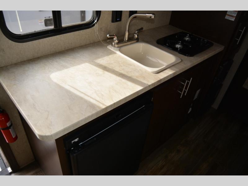 To the left of the entrance you will find a cooking area featuring plenty of counter space, a single sink, a two burner cook-top, and refrigerator for your perishables located beneath the counter. There is also a pantry for dry and canned goods, as well as storage for dishes and things.