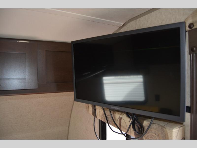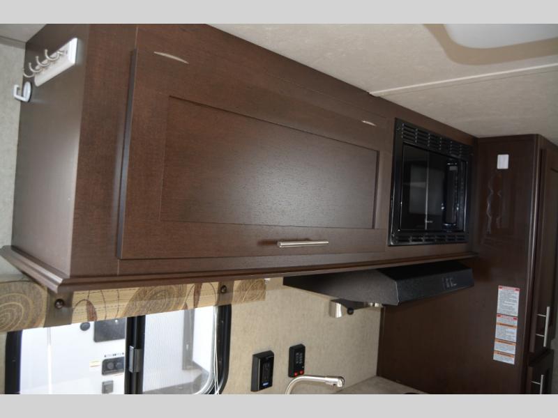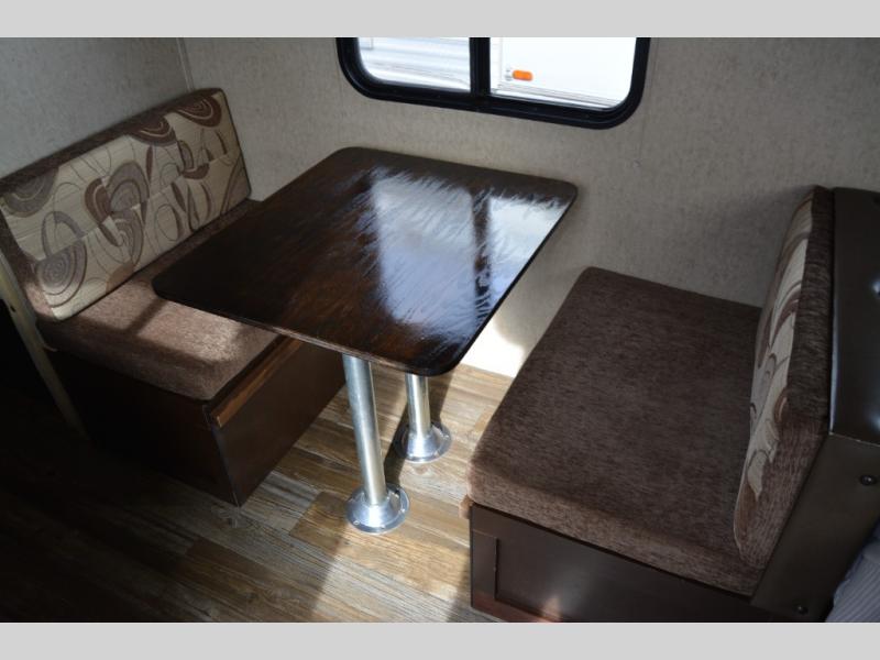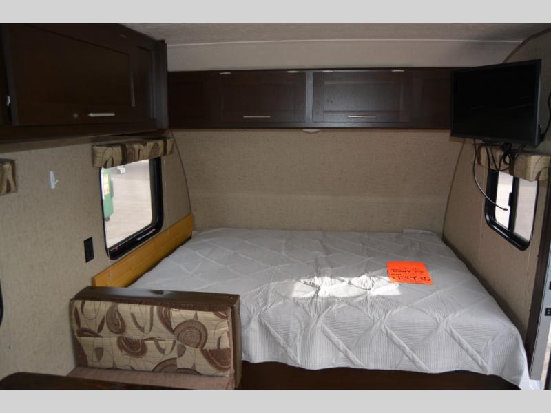 Step inside and find a queen size bed across the front with storage cabinets above two side, over the head of the bed, and along one side. The side cabinets stretch from the head of the bed along the road side wall over the dinette that is located straight across from the door.