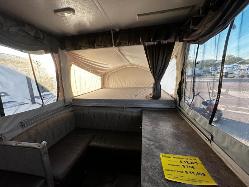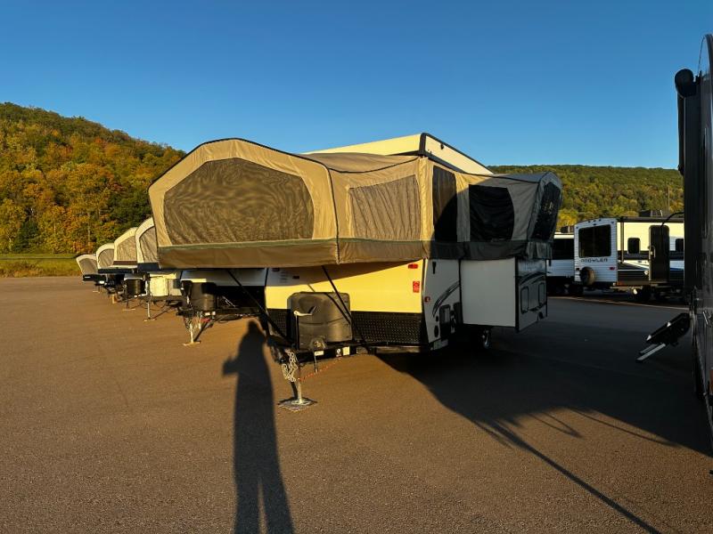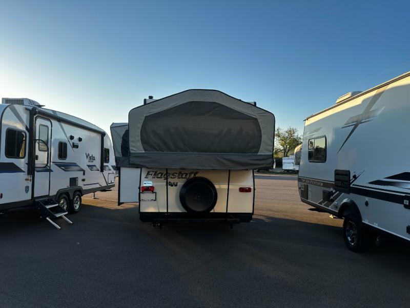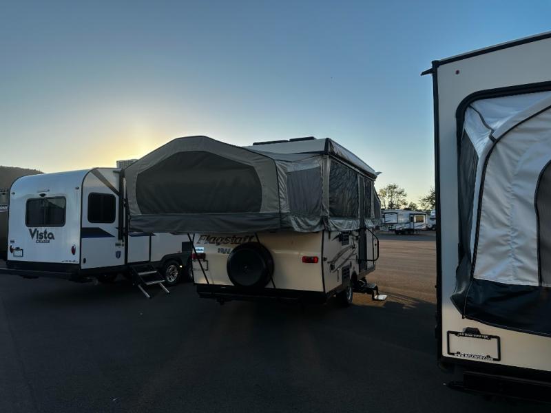 The Flagstaff High Wall HW27SC folding pop-up camper offers a single slide out, a guacho, plus a front king size tent end bed and rear queen tent end bed.
