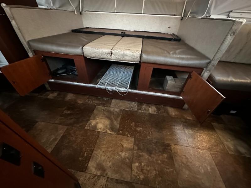 In the rear of the camper there is a queen size tent bed. The front of the camper offers a king size tent bed. Back near the entry door, on the right is a cabinet, microwave, and gaucho seat. The dinette is on a slide, which helps to add more floor space.