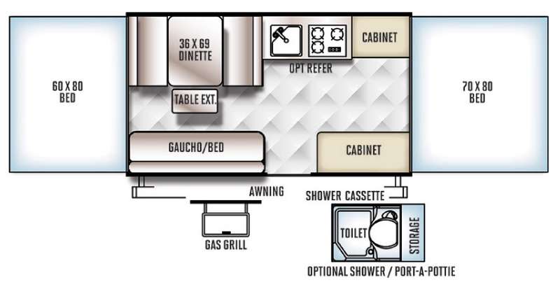 As you step inside to your left is a gaucho/bed for relaxing or sleeping. The opposite side offers a dinette with a table extension to allow for more work space or dining area. There is also a sink, three burner range, cabinet, and optional refrigerator. Next to the front tend bed is a cabinet or you can choose and optional shower and port-a-pottie instead.