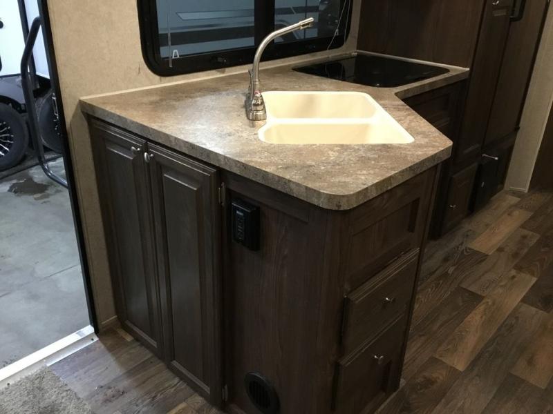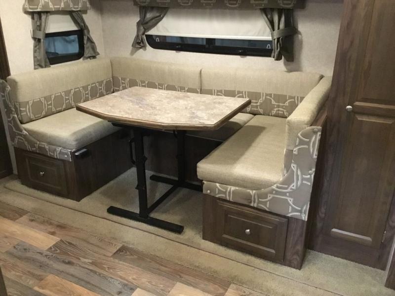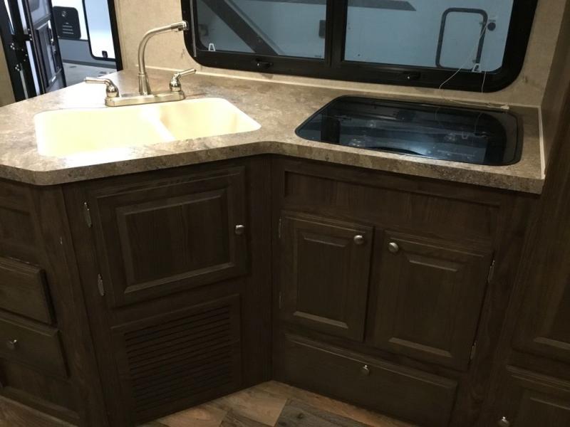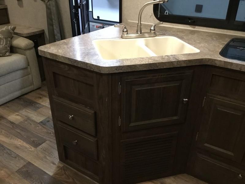 The slide offers a u-dinette and a wardrobe. Next to the slide you will find an entertainment center. The opposite side of the trailer has a c'top extension, double kitchen sink, three burner range, microwave, pantry, and refrigerator.