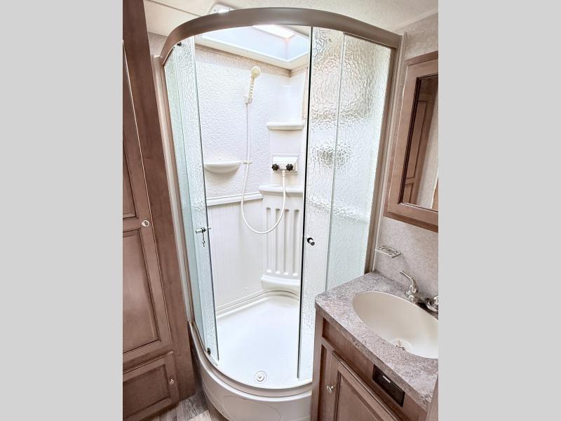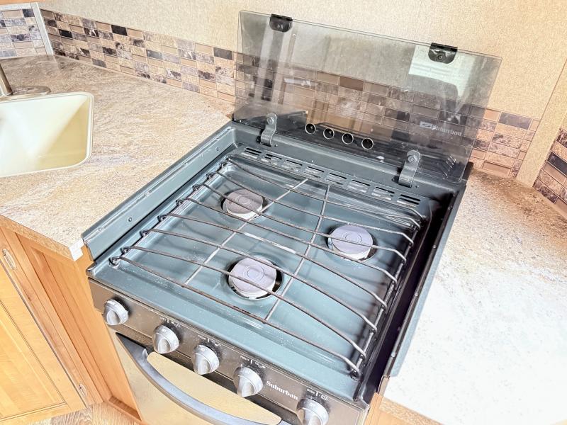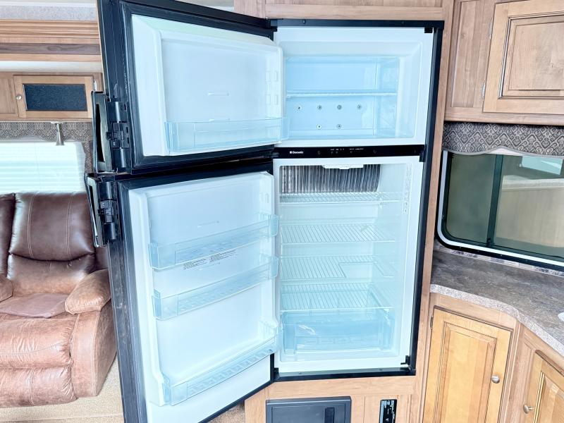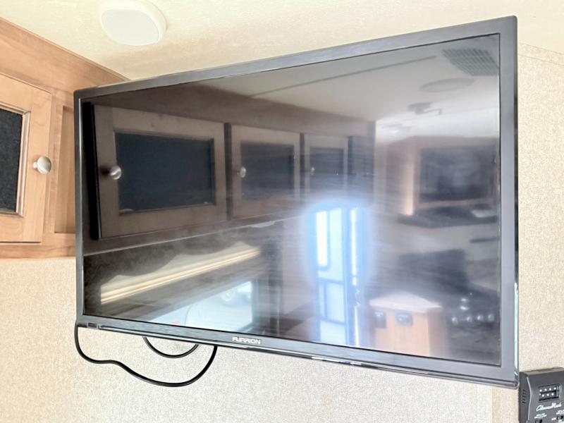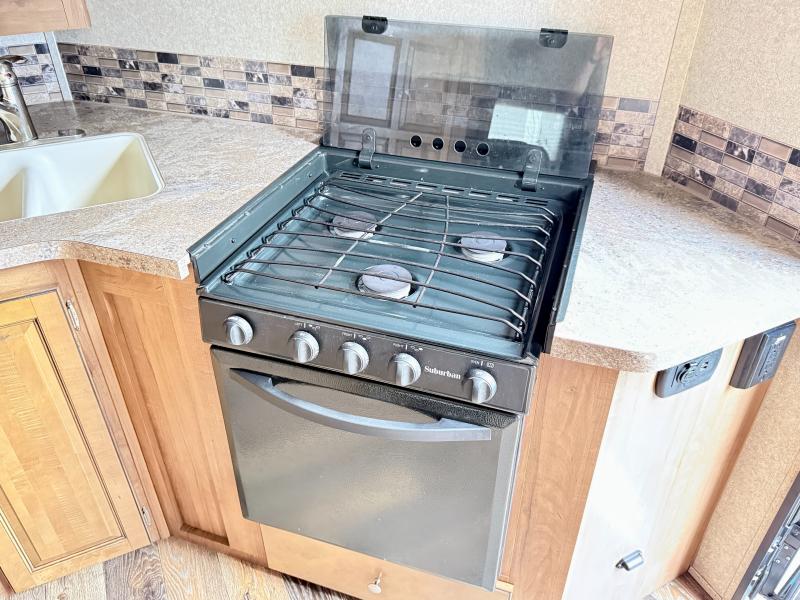 As you enter the front entrance of the trailer, along the front you will find the kitchen with a three burner range, large sink, and refrigerator. The slide has a pantry and hide-a-bed sofa or you can choose an optional theater seating. Across from the slide there is a dinette with an overhead LCD TV.