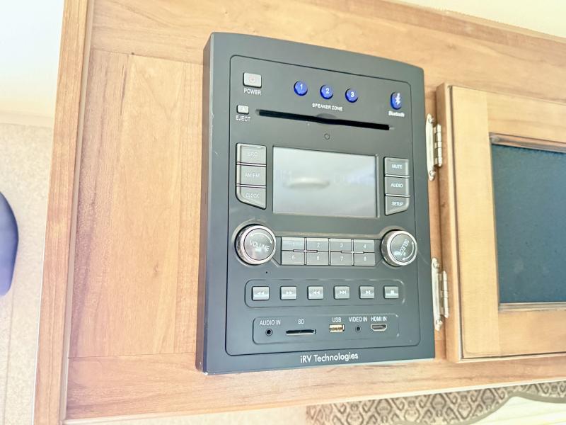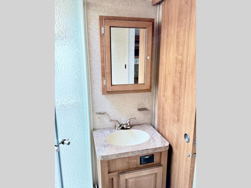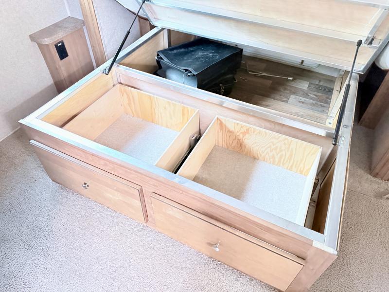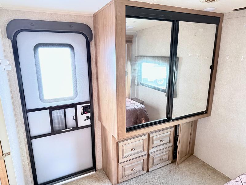 In the rear bedroom the slide helps to open up the floor space. The queen bed and nightstands are located on the slide. Across from the bed you will find a large wardrobe, and along the wall you can choose to add an optional TV. There is also a private entrance door leading outside from the bedroom.