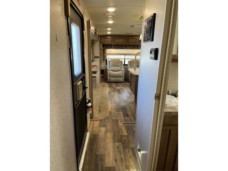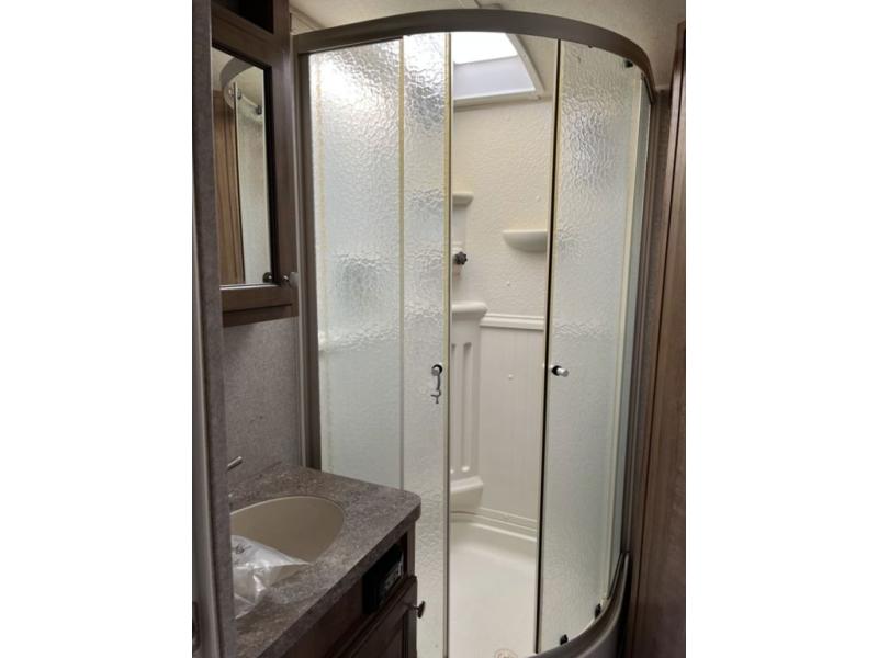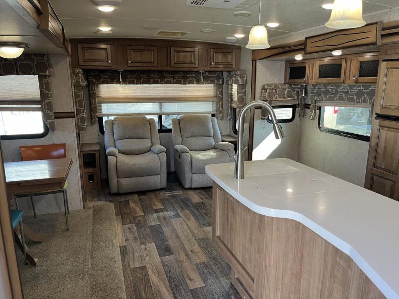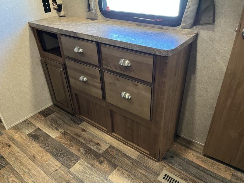 As you enter the travel trailer, to the left you will find a slide with a corner entertainment center with optional fireplace, and a free-standing dinette. Along the rear wall there are two chairs and two end tables. You can choose two recliners in place of the chairs. The road side slide has a hide-a-bed sofa with overhead cabinets, a refrigerator, and a pantry. Along the front side of the kitchen area there is a three burner range and microwave. The l-shaped counter provides extra counter space as well as the large sink.