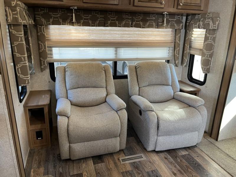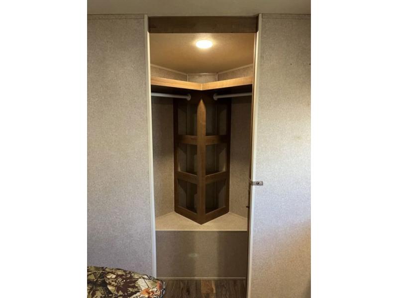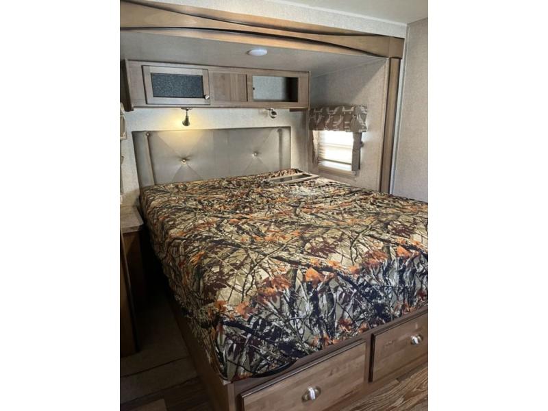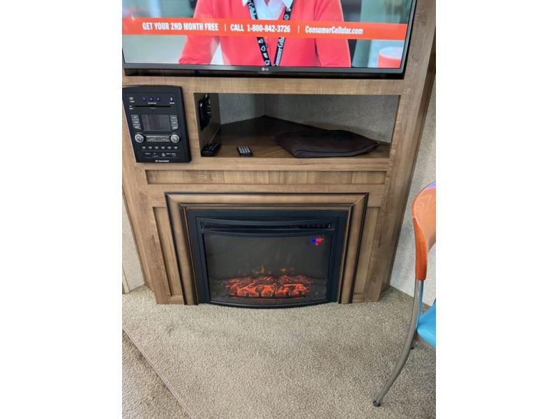 There are plenty of overhead cabinets throughout the trailer as well as exterior storage. Outside there are two awnings, a fireplace, and a rear ladder, plus you can choose an optional gas grill, and more!