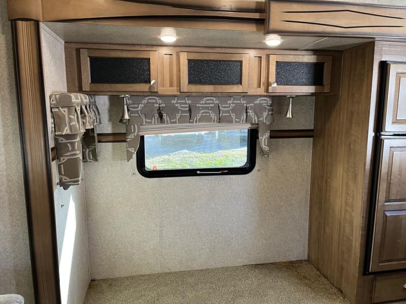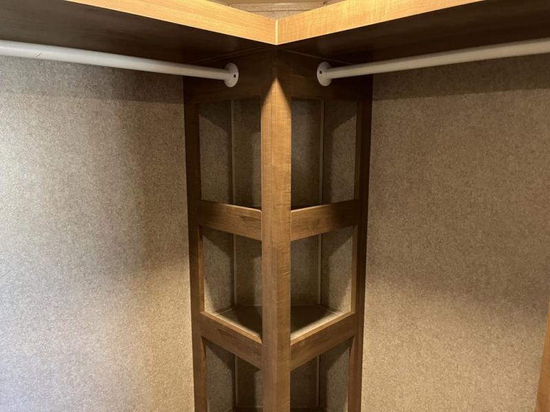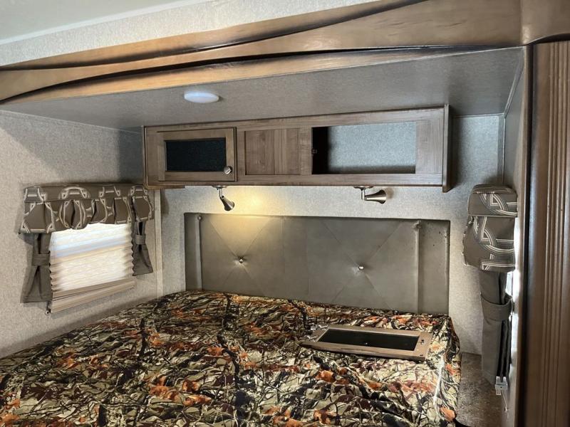 In the front bedroom you will find a queen bed slide with nightstands on either side, a large front wardrobe in the v-nose, and a vanity with overhead cabinets and optional TV above.