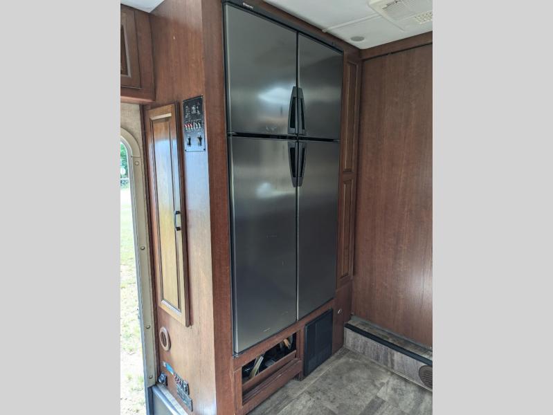 The living and kitchen areas feature a sofa with overhead cabinets, a two door refrigerator or you can choose an optional four door refrigerator, and a pantry along one wall. The opposite side boasts an L-shaped kitchen counter with three burner range, overhead microwave and cabinets, and a flip down countertop extension. There is also a dinette with overhead cabinets.