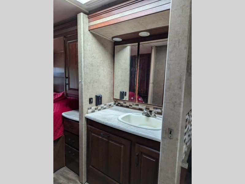 The rear features a queen bed with nightstands on both sides as well as a shirt closet on one side. Across from the bed, you will find two wardrobes with linen storage between them and space for an optional TV. The split bathroom is part of this private bedroom. It features a private area with a toilet and tub/shower combination on one side, with a hamper and large vanity sink on the other.