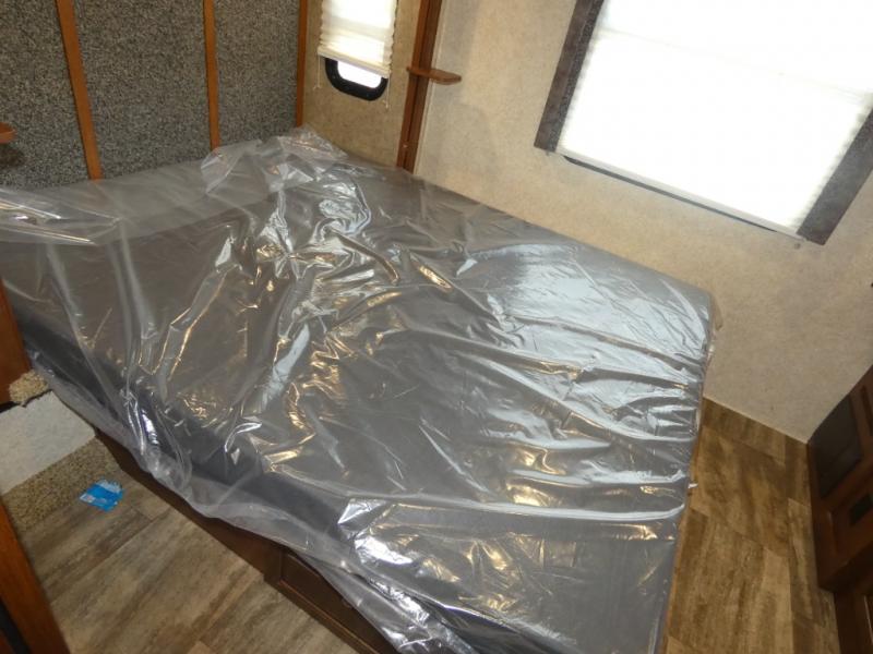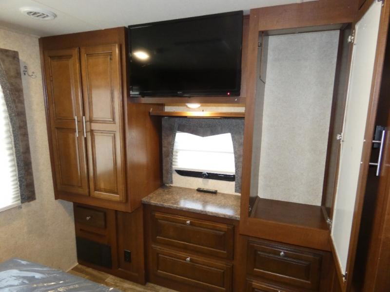 The bedroom has a queen bed slide, double wardrobes, and a TV. There is plenty of overhead cabinet space in this motor home.