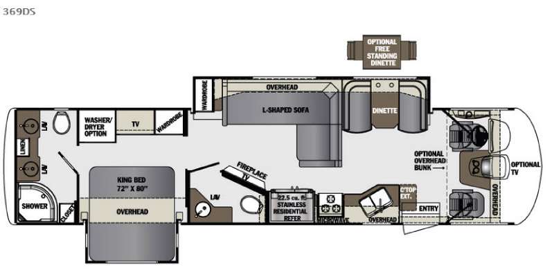 The bedroom has a king bed slide with an overhead cabinet above the bed. There is also a wardrobe, TV, and optional washer and dryer.
