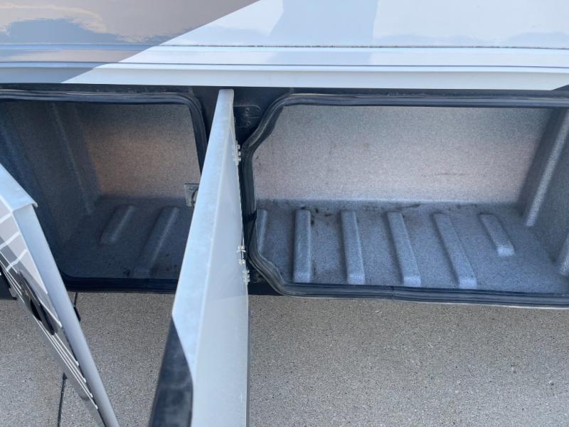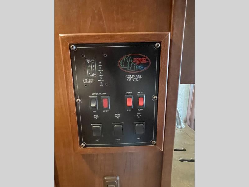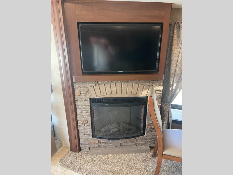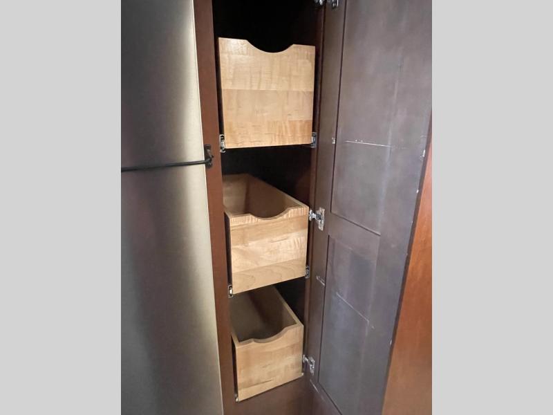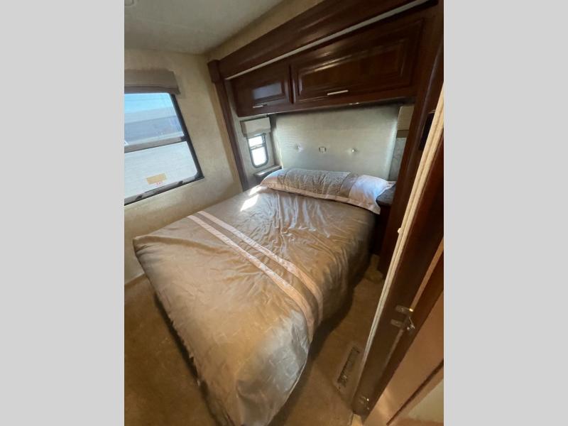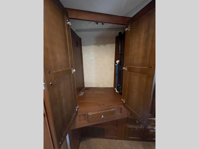 In the bedroom you will find a slide with a queen size bed, overhead cabinets, and nightstands. On the opposite side of the room you will find a large wardrobe, TV, and an optional washer/dryer.