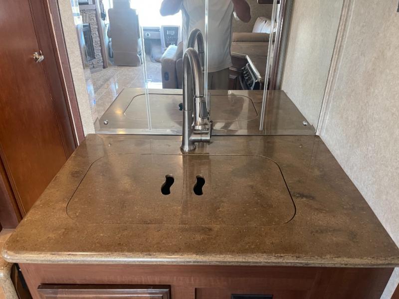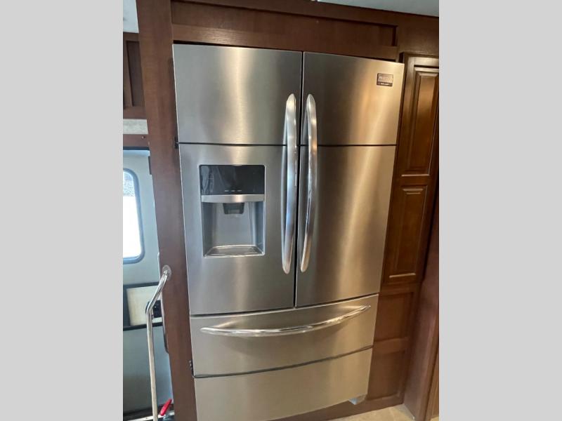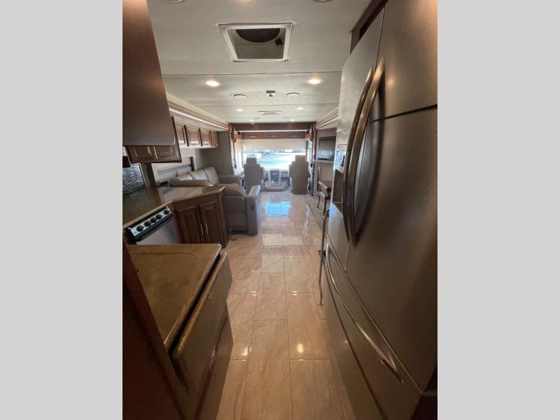 Stepping inside the model to the right there is a slide with a free-standing dinette, and just past the dinette there is a corner TV and fireplace. The opposite slide has an chair, hide-a-bed sofa or optional L-shaped sofa, three burner range, and microwave slide. Proceeding through the motor home you will find a double kitchen sink, and a refrigerator and pantry.