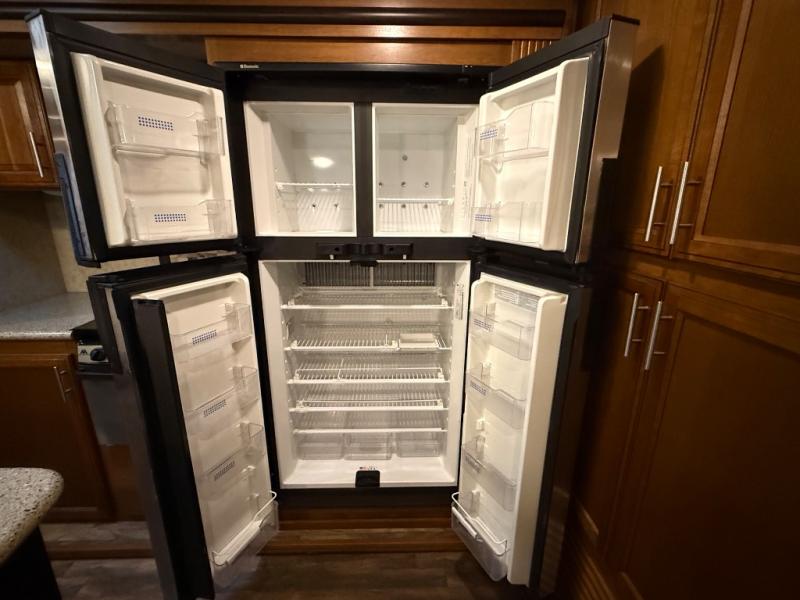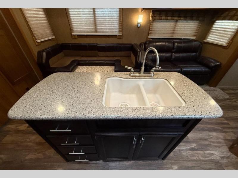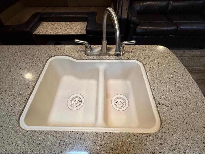 Inside the travel trailer, to the right is a closet and an entertainment center. The kitchen offers two slides. One slide has a three burner range and a refrigerator. The other slide has a u-shaped dinette and hide-a-bed sofa. You are sure to enjoy the kitchen island which has a double kitchen sink and lots of counter space. You will also find a large pantry in the corner of the kitchen.