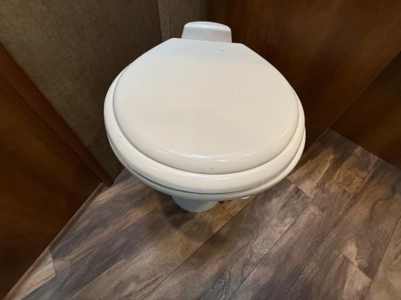 As you proceed toward the front of the trailer, you will find a side aisle bath with a toilet, corner shower, and sink.