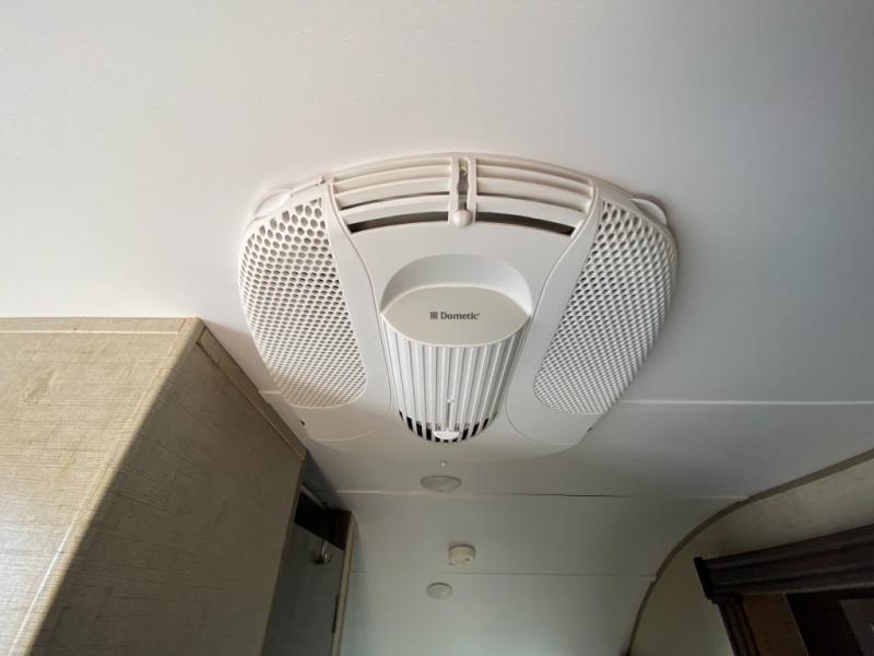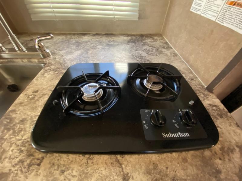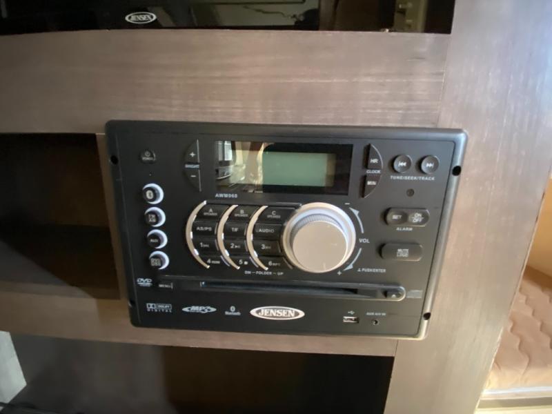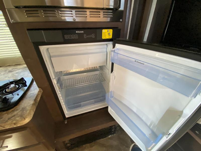The slide has a single sink, two burner range, and refrigerator. Next to the slide is an entertainment center.
