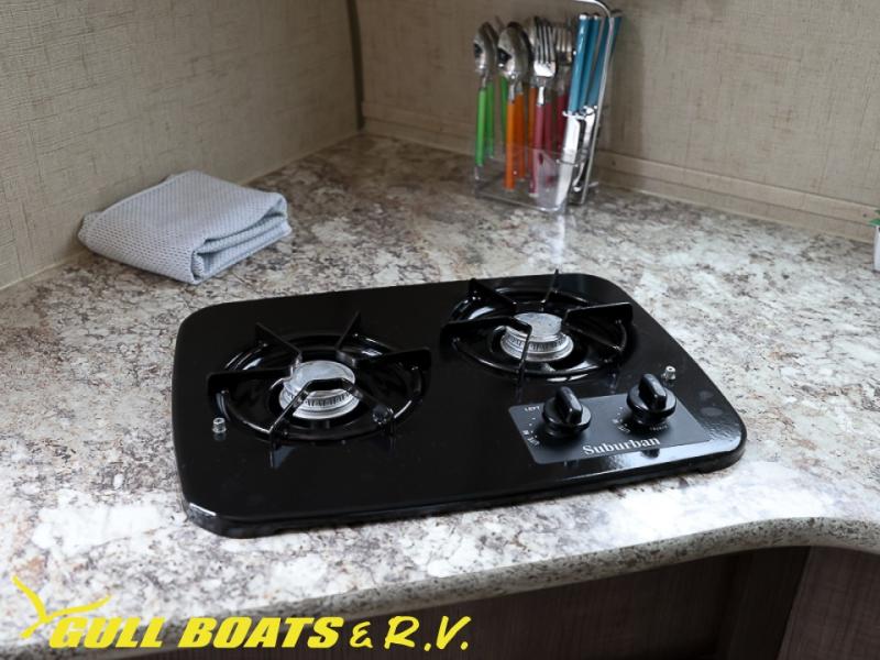 As you enter the travel trailer, along the rear you will find a two burner range, and sink. The slide has a refrigerator and a U-shaped dinette. The opposite side of the trailer has a pantry, bath with toilet and shower, and a wardrobe.
