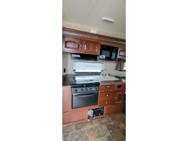 One side of the trailer has a slide with a three burner range, double kitchen sink, and sofa. Adjacent to the range you will find a pantry for your canned goods. Across from the sofa there is a refrigerator, 44" dinette, and entertainment center.
