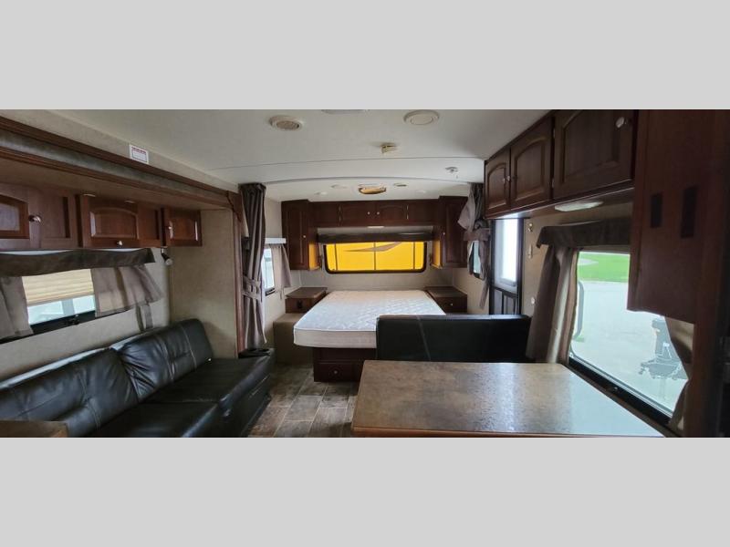 In the front, you will find a queen bed with flip-up storage under the bed. Wardrobes, nightstands, and an overhead cabinet can also be found in the bedroom area.