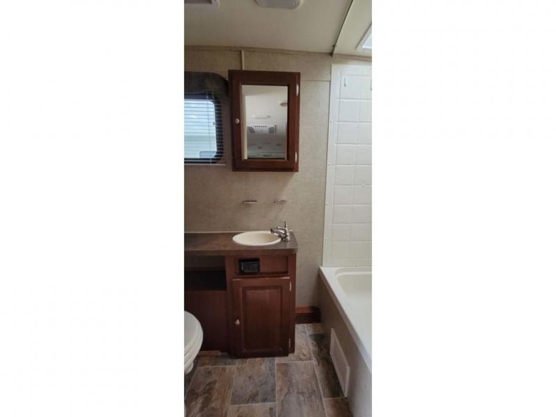 As you enter the travel trailer, to the left is the bathroom. Inside you will find a tub, sink, medicine cabinet, toilet, and wardrobe.