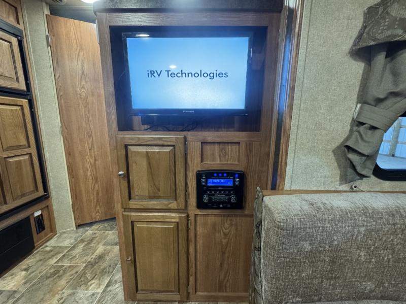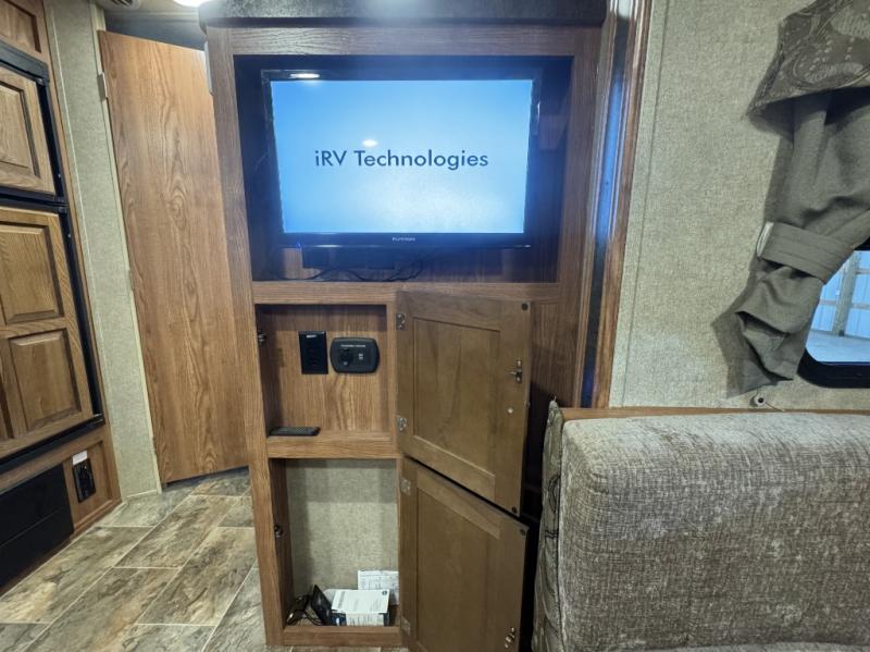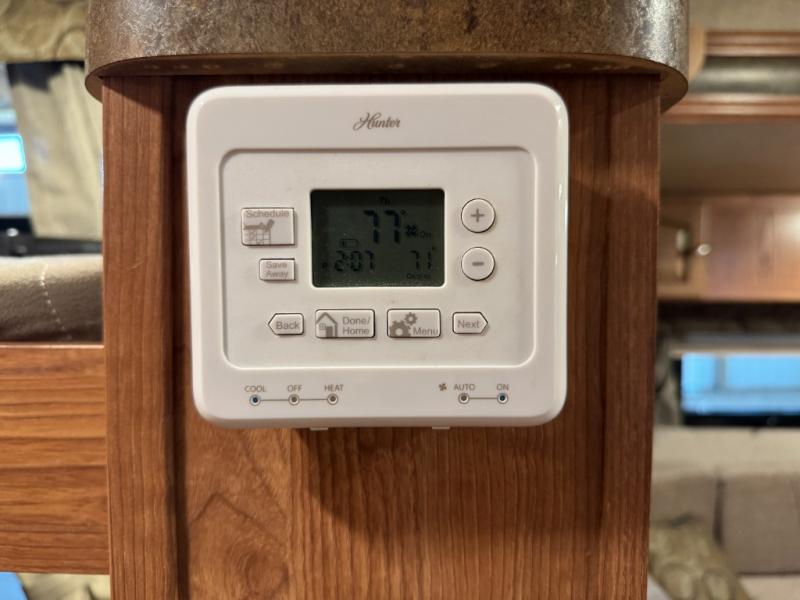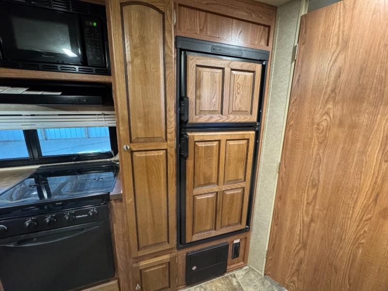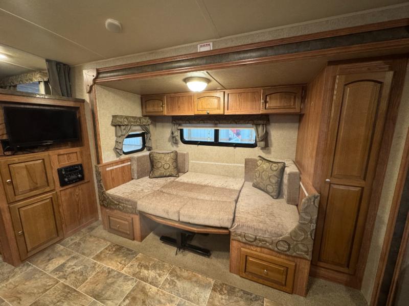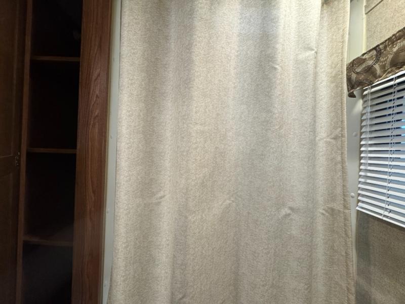 The kitchen area offers a counter top extension, double kitchen sink, three burner range, microwave, pantry, refrigerator, and a slide with a wardrobe and a u-shaped dinette. Adjacent to the slide there is an entertainment center for your enjoyment.