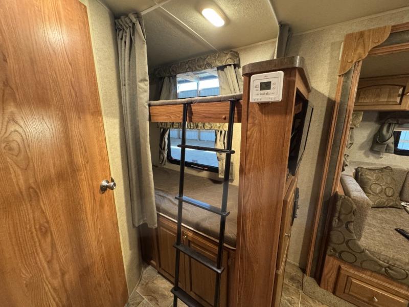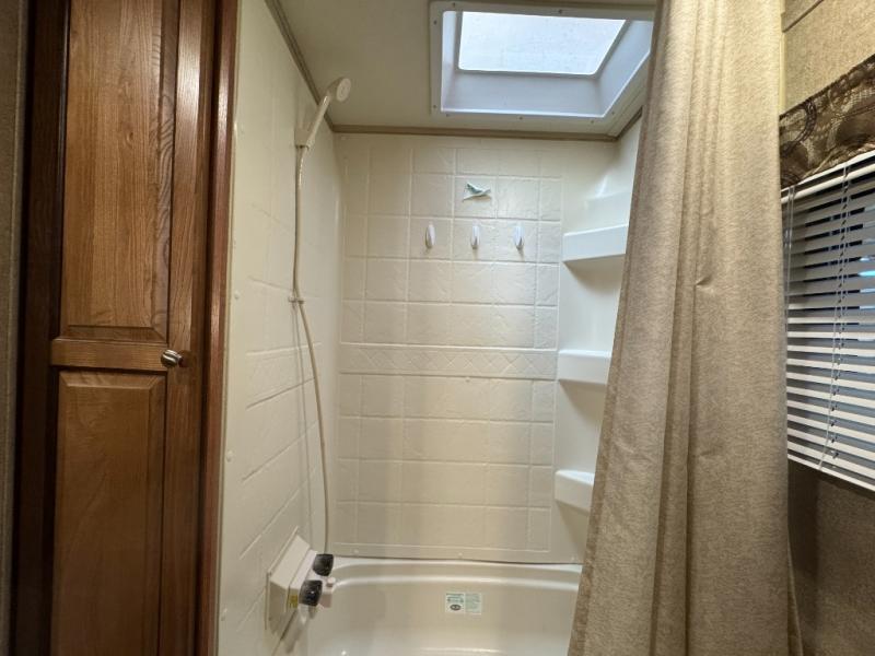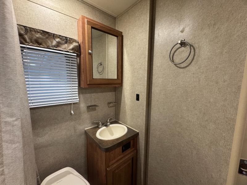 In the rear of the travel trailer you will find a set of bunk beds and a bathroom. The bathroom has a toilet, sink, medicine cabinet, and tub.