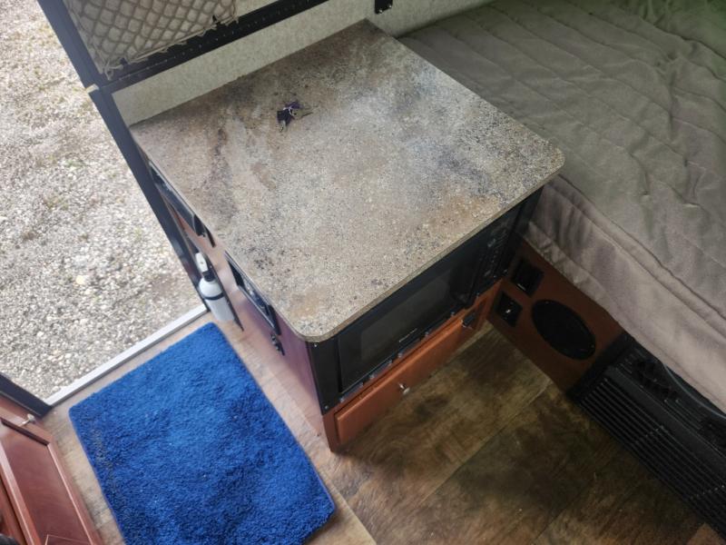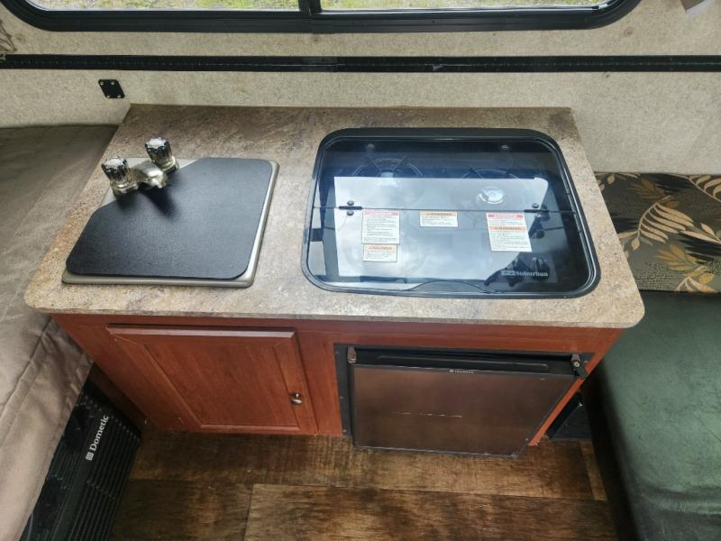 When it's time to make meals there is a three burner range, single sink, and refrigerator on a swing galley along the road side. On the opposite side, you will find a microwave inside a cabinet allowing you to heat up your leftovers.