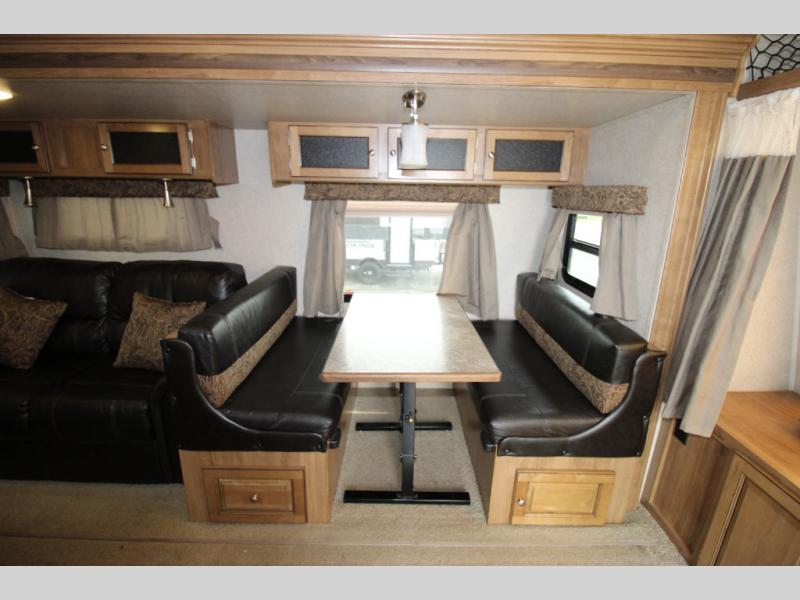 The road side slide out includes a 60" sofa or optional theater seating or a hide-a-bed, plus a 44" booth dinette and full length overhead cabinets. You may choose the optional free standing table with chairs in place of the dinette.
