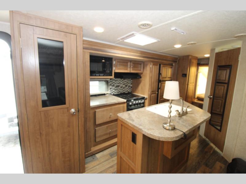 The kitchen island includes a double kitchen sink and counter space for cleaning up or serving meals. The second slide out features a pantry, refrigerator, overhead cabinets, countertops, three burner range, and an overhead microwave.