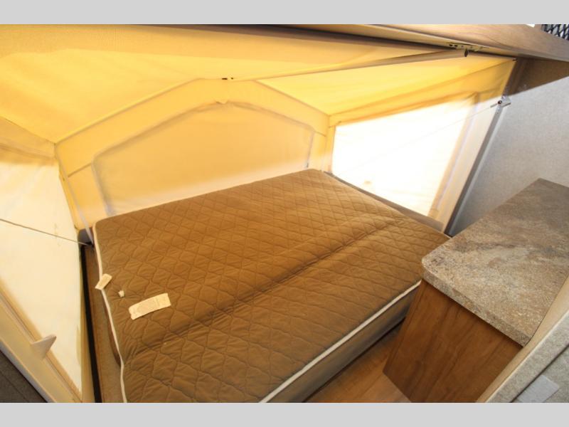 Front and rear queen tent end beds offer a shelf above the opening for extra storage. A wardrobe is next to the rear bed with a lower shelf included. The entertainment center is to the right as you enter the trailer.