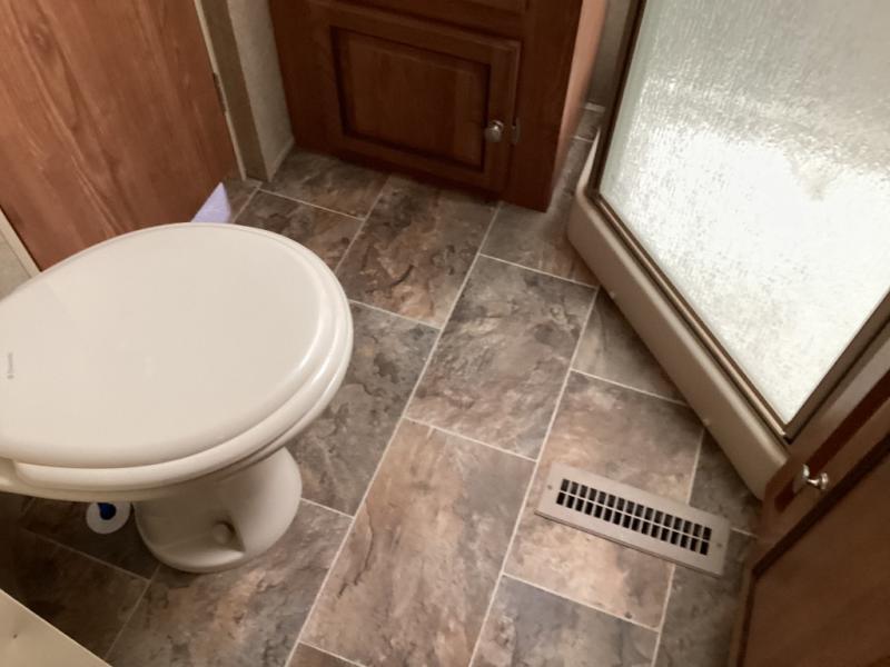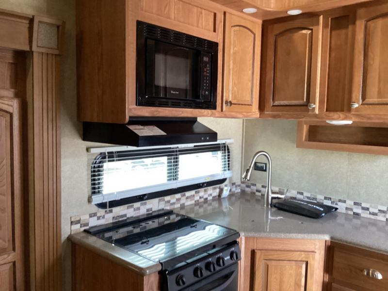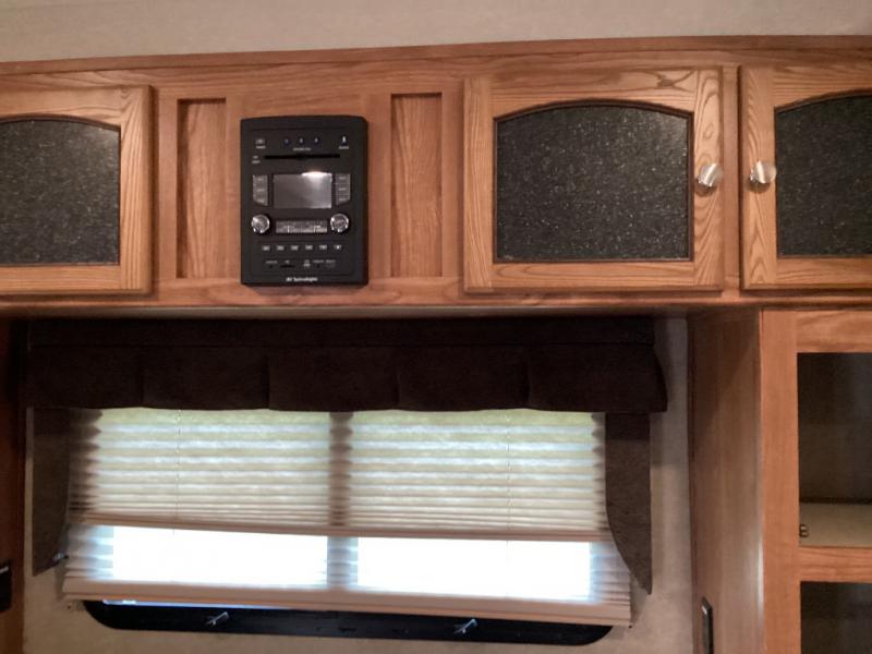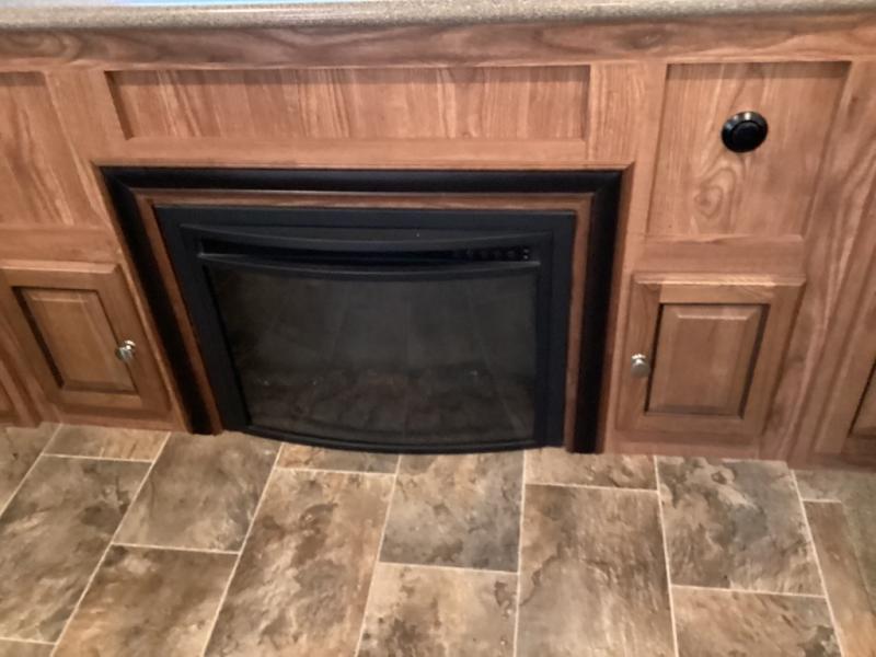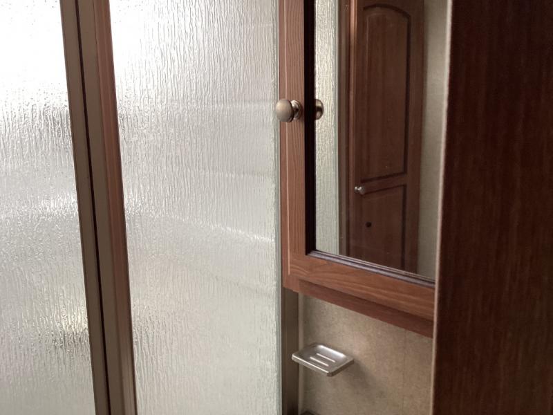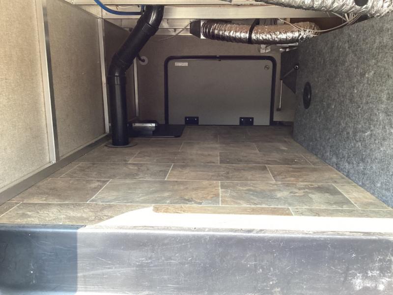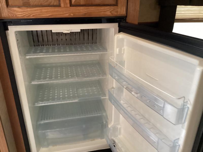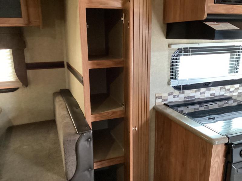 To the left of the entrance you will find a slide with a refrigerator and hide-a-bed sofa. On the opposite side there is a slide with a dinette and pantry, or an optional free-standing table. Next to the slide you will find a three burner range, microwave, and double kitchen sink. Along the rear wall there is a nice size entertainment center with a lift TV and cabinet shelves on either side.