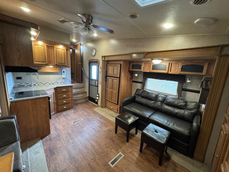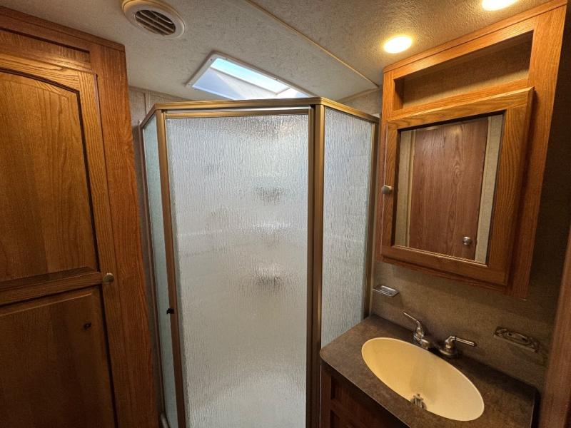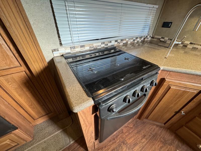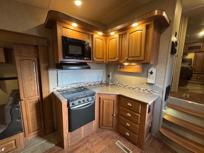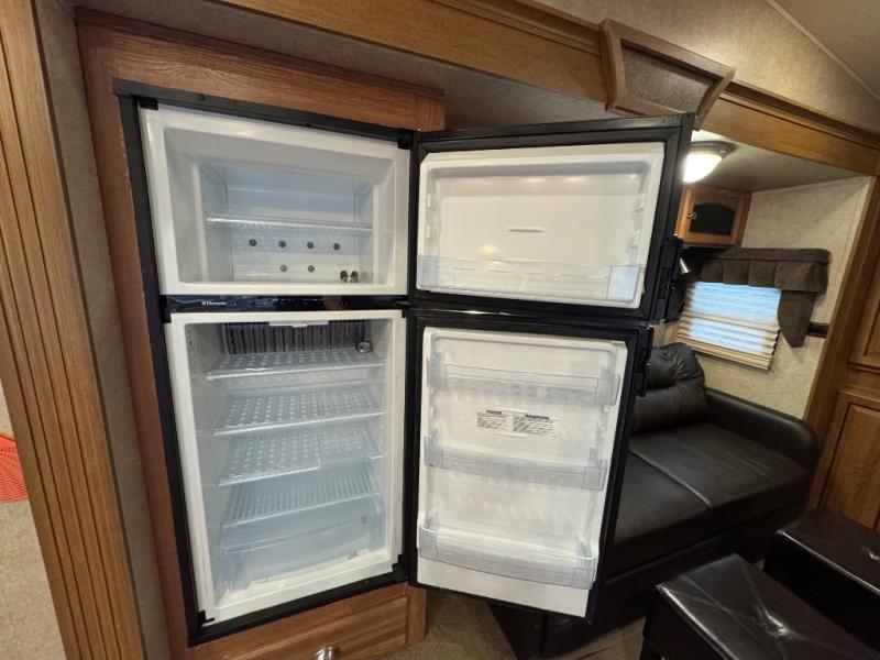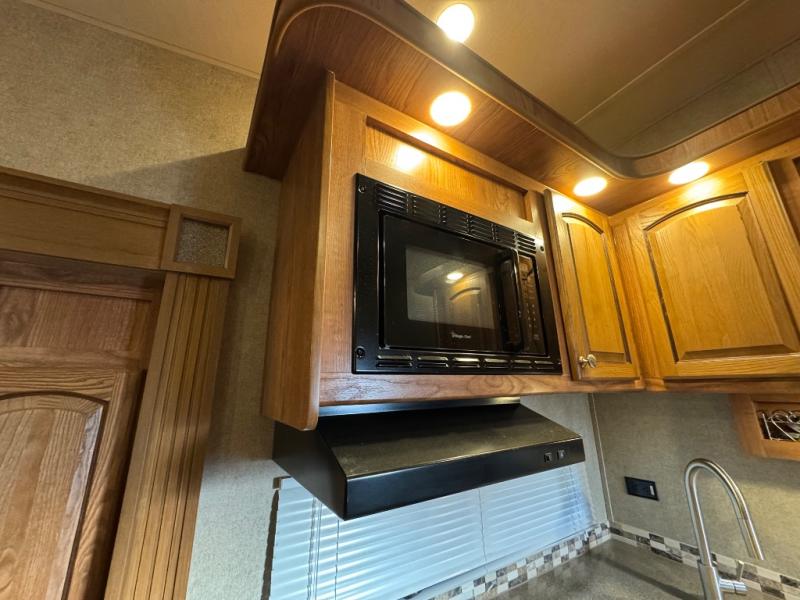 To the left of the entrance you will find a slide with a refrigerator and hide-a-bed sofa. On the opposite side there is a slide with a dinette and pantry, or an optional free-standing table. Next to the slide you will find a three burner range, microwave, and double kitchen sink. Along the rear wall there is a nice size entertainment center with a lift TV and cabinet shelves on either side.